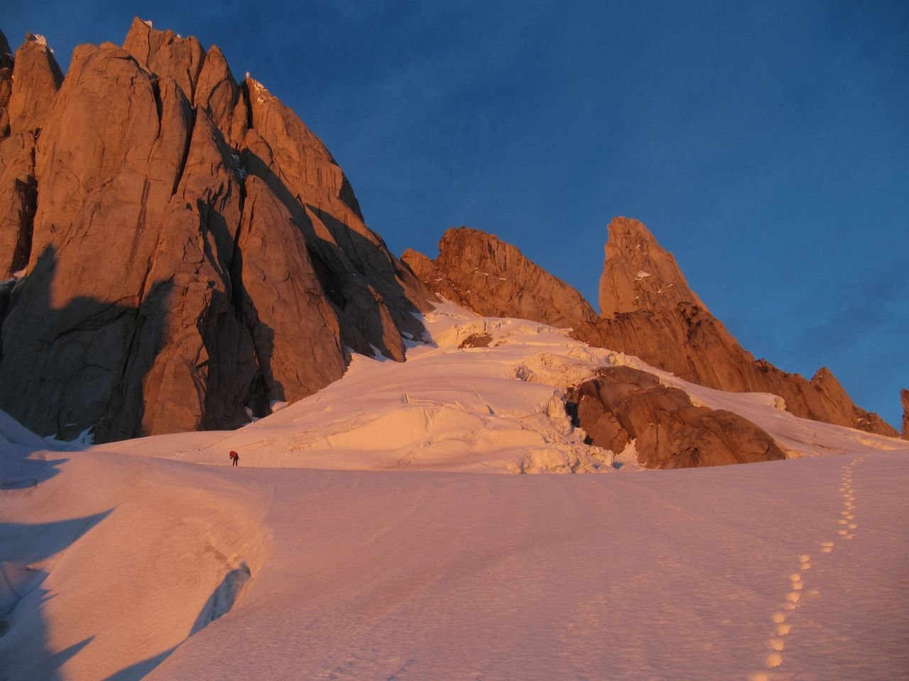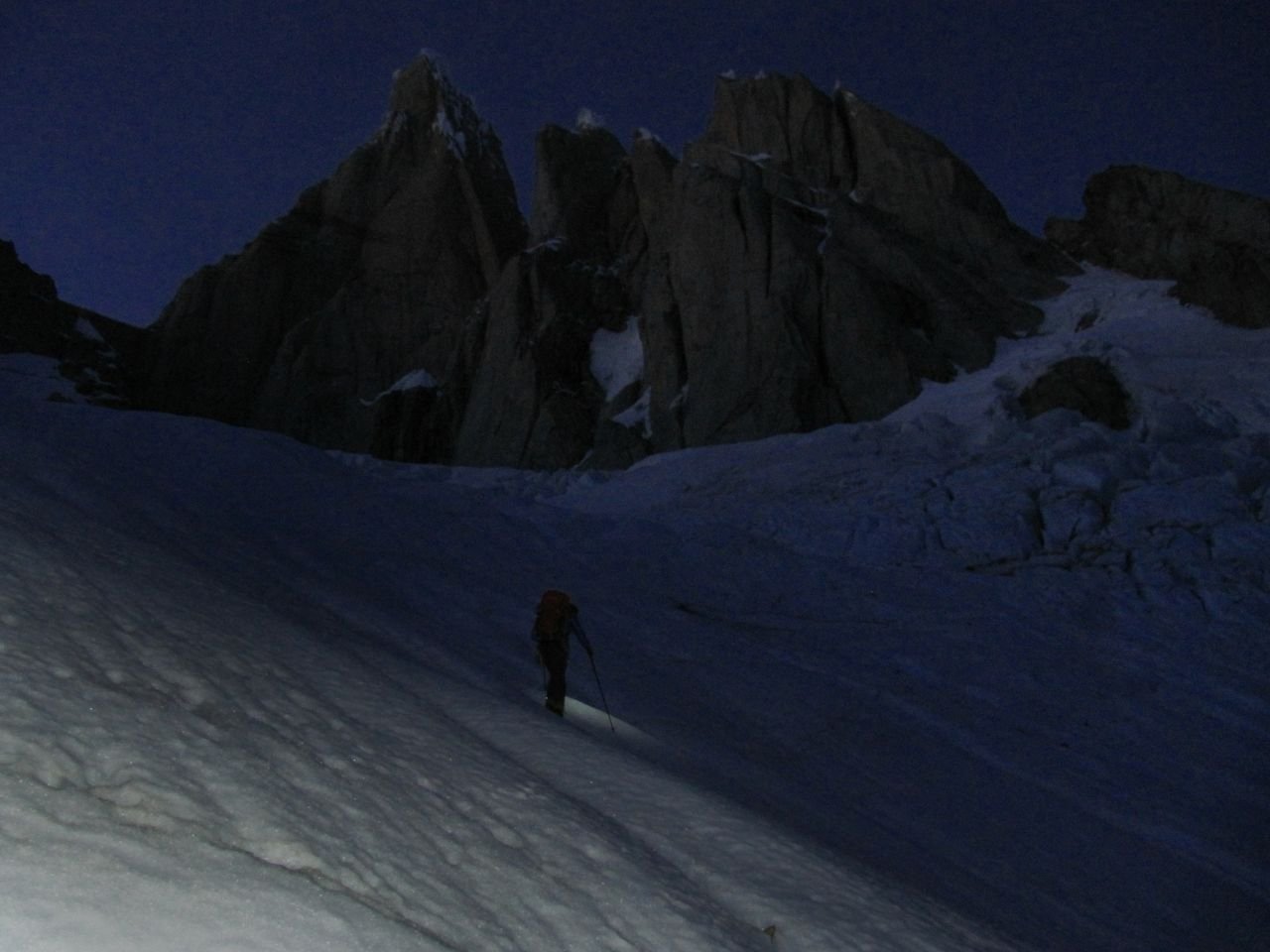 Schon nach kurzer Zeit holte ich die erste Seilschaft ein, dann die zweite und schließlich noch die dritte. Nach ungefähr 80 Metern über dem Col war ich wieder alleine - alleine mit dem Cerro Torre und der Nacht. Es war ganz still, nur der Wind flüsterte mir noch ins Ohr, es war wunderschön!
