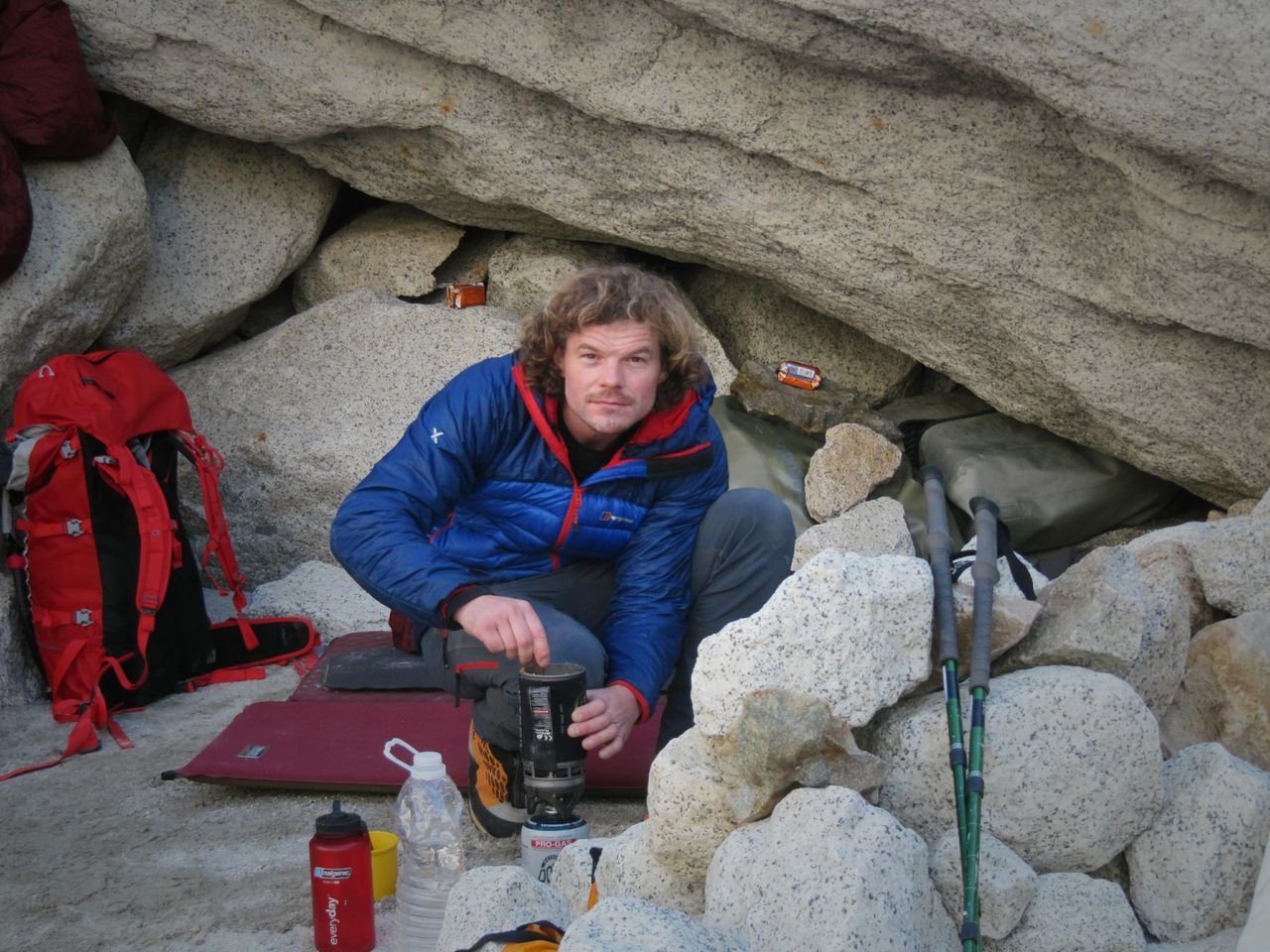 Meine Ausrüstung waren nur eine Eisschraube, um Eissanduhren zu machen (zum Abseilen), mein Abseilgerät, ein 60 Meter Halbseil zum Abseilen, Steigeisen und zwei Eisgeräte. Und natürlich eine Stirnlampe!"