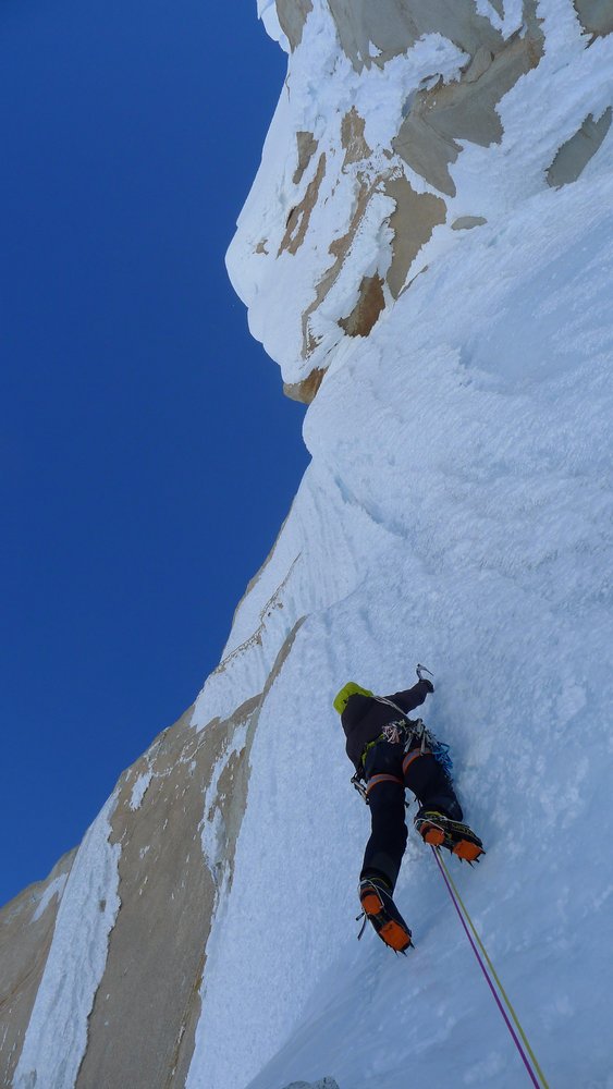 Nach der langen Anreise ging von Anfang an alles Schlag auf Schlag und wir konnten einige große Routen wie den Poincenot Klassiker „Whillans-Cochrane“ (550m, 5+, 70°, M4), den gewaltigen Eisschlauch „Exocet“ (500m, WI5+, 5+) auf den Cerro Standhardt innerhalb der ersten 3 Tage machen.