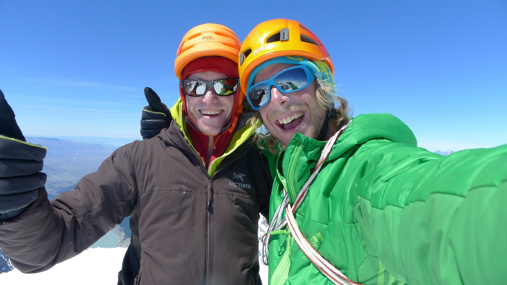 Wir haben es da weit besser erwischt, festes Eis mit teilweise Schneeeinlagerungen machten die Sache schon spannend aber bei weitem nicht so zeitintensiv und so erreichte ich nach ca. 20 Minuten den letzten Standplatz unterm Gipfel. Um kurz vor 13:00 Uhr standen Max und ich dann oben auf dem Gipfel des Cerro Torre und konnten uns überglücklich und beinahe fassungslos die Hände schütteln und dem wohl schönsten aller Berge auf den Kopf klopfen. Keine Wolke, kein Wind, T-Shirt Temperaturen, Bergsteigerherz was willst du mehr?…Unbeschreiblich ;-)