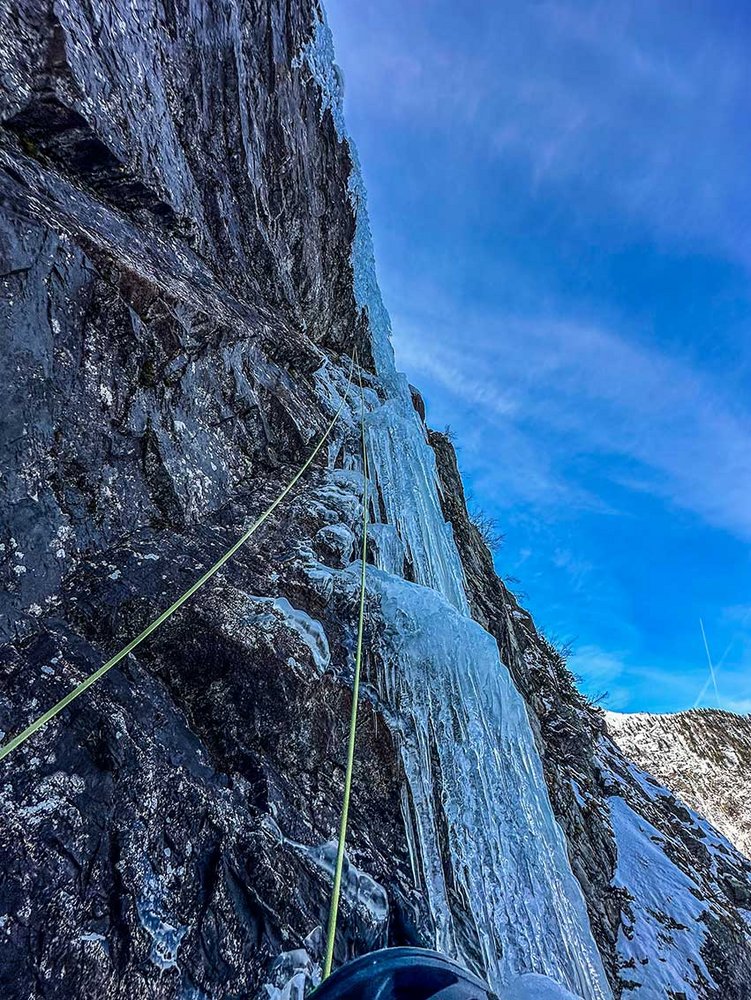 The first strike of my ice tool set the wall to singing. The sound rolled deep through the valley, metallic and resonant, like the groan of a long-forgotten ship buried in stone. The ice was clear and smooth, almost liquid in its perfection, as if frozen from the depths of a dark, ancient sea.