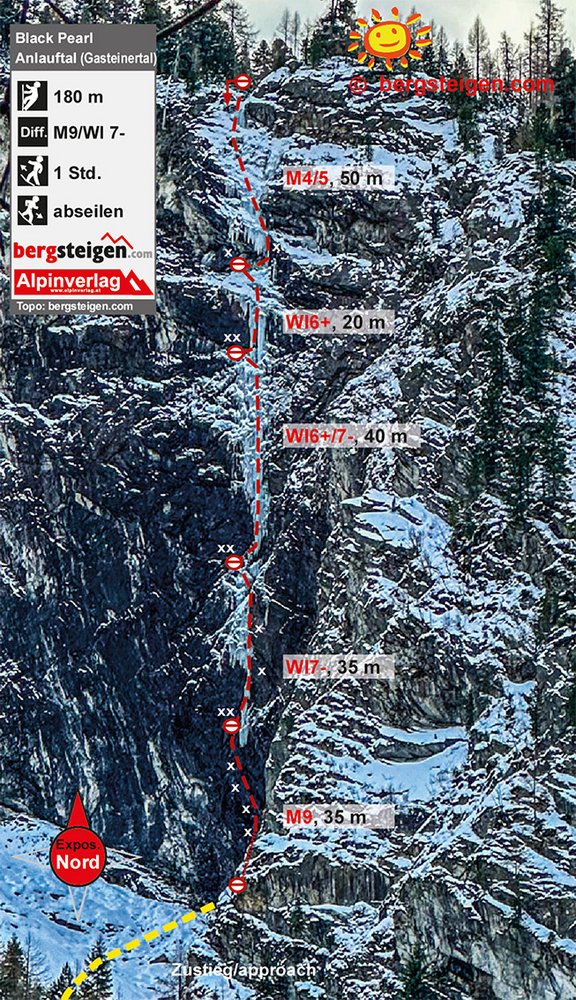In der Dämmerung erinnert ihr Anblick an einen uralten Schiffsrumpf aus Stein, halb im Gebirge versunken. Die Einheimischen nennen sie schlicht schwarze Wand. Nicht nur wegen ihrer Farbe, sondern wegen ihres Charakters: scharfkantig, abweisend, unberührt wie ein Mysterium. Inmitten dieser überhängenden Wand, ein filigranes Band aus gefrorenem Wasser, das sich wie ein geheimer Pfad hinaufzieht. Seit unsere Kindheit kennen wir die Geschichten über die Black Pearl – jenes legendäre Schiff, das durch Nebel und Nacht glitt, auf der Suche nach verfluchten Schätzen, die niemand je gesehen hatte und die niemand besitzen konnte, ohne einen hohen Preis zu zahlen. Man erzählte, die Pearl tauche überall dort auf, wo ein Schatz verborgen lag, und wer ihrer Spur folgte, würde genau das finden, was man am meisten suchte – oder am meisten fürchtete.