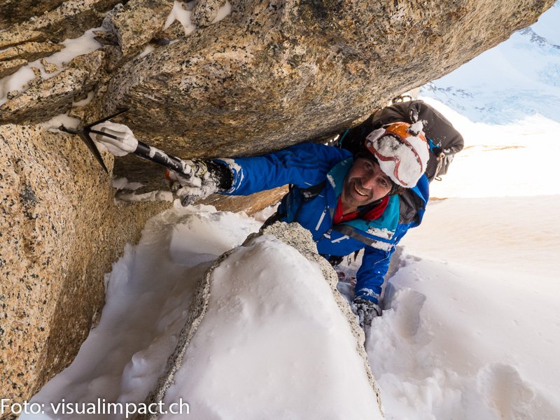 1999 haben wir uns in 4 Stunden nordseitig durch das gefürchtete Rime-Ice (Anraumeis) hochgekämpft. Dani findet weiter in der Westwand eine Rinne, in der kaum Anraumeis anzutreffen ist. Gleichwohl sind die ersten fünf Meter - selbst für den Eismeister - kein „Kinderfasching“. Sobald ich nachgestiegen bin, bereite ich schon mal die erste Abseilstelle am Nordende des Pilzes vor. Es schaut anders aus hier oben als vor 14 Jahren und wir haben dank des zuverlässigen Wetterberichtes die Sicherheit, dass sich das Wetter in den nächsten Stunden auch nicht ändern wird. Beim letzten Mal haben wir aufgrund eines heraufziehenden Sturms auf die Besteigung des rund 10 Meter aufragenden Reifpilzes verzichtet. Für uns machte das damals keinen Unterschied.