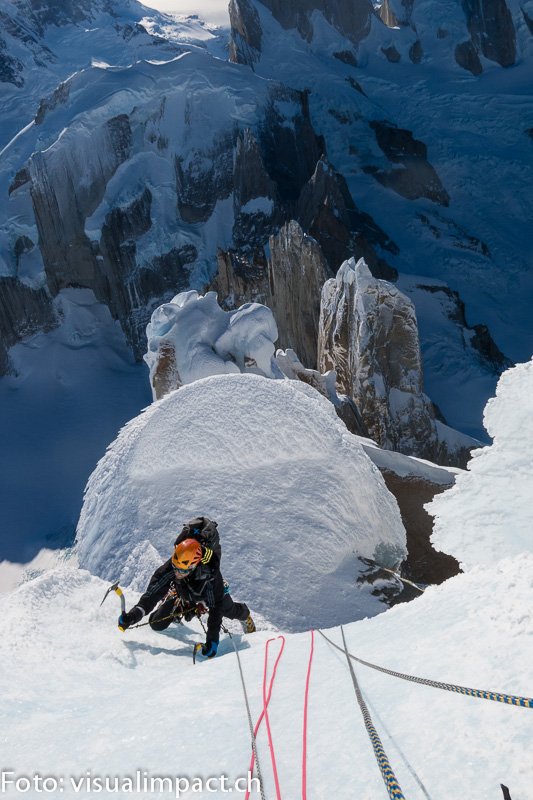 Obwohl sich in den 14 Jahren die Formationen natürlich stark verändert haben, erinnere ich mich noch an die eine oder andere Stelle. Durch einen kleinen Kanal erreiche ich den Grat, der die Westwand von der Nordwand trennt. Ich schlängle mich durch unwirkliche Eisgebilde. Es „pfeift“ in die Tiefe zum „Col de Conquest“ - dem Einschnitt zwischen Cerro Torre und Torre Egger. Unter dem Gipfelpilz mache ich wieder Stand. Mein Blick wandert rüber zum Fitz Roy und auf das Gebirge auf der chilenischen Seite des „Hielo Continental“ - einfach fantastisch!