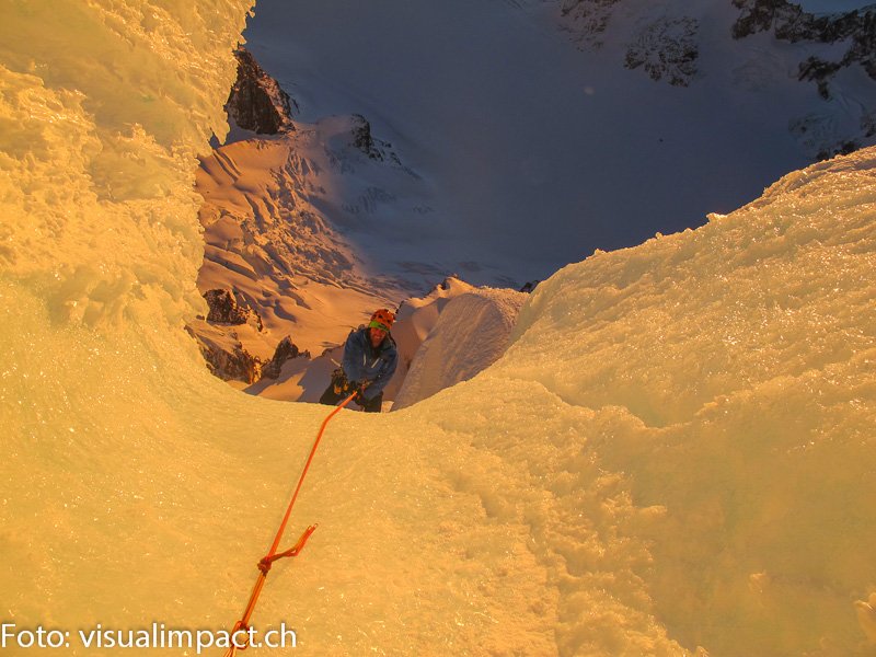 Das Wetter unglaublich gut. Keine Wolke ist zu sehen! Unser Team funktioniert perfekt. Während Thomas und Tibu nachstiegen, nimmt Dani die letzte Seillänge in Angriff – den mächtigen Gipfelpilz aus Eis.