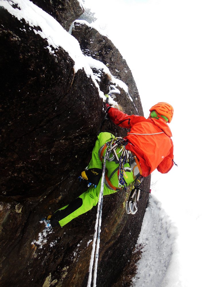 Alle guten Dinge sind bekanntlich drei. Gestern lud mich Picco - Christian Piccolruaz, dazu ein, ein schon länger widerspentiges Projekt von ihm im Stubaital zu probieren. Die erste Seillänge wehrte sich bis jetzt allen Freikletterversuchen und die Tatsache, dass die Route 190 Meter lang ist, machten es für mich besonders interessant die Einladung von Picco anzunehmen. Und wie es sich für Picco's Mixedrouten gehört, ist auch diese Route nicht ohne Anstrengung und Konzentration zu meistern. Mit einer verbogendne Haue und bereits etwas mißmutiger Stimmung nach dem Auschecken, gelang es mir dann doch noch im ersten Versuch den "schweren Riss" frei zu klettern. Picco brach sich gleich danach seine Haue an der selben Stelle und so mussten wir die restlichen Seillängen mit Materialschwäche etwas vorsichtig weiter klettern. Am Ende lief alles gut und die "Bese Hexe" wartet nun auf Wiederholer mit Schwierigkeiten bis M9+ und WI7-.