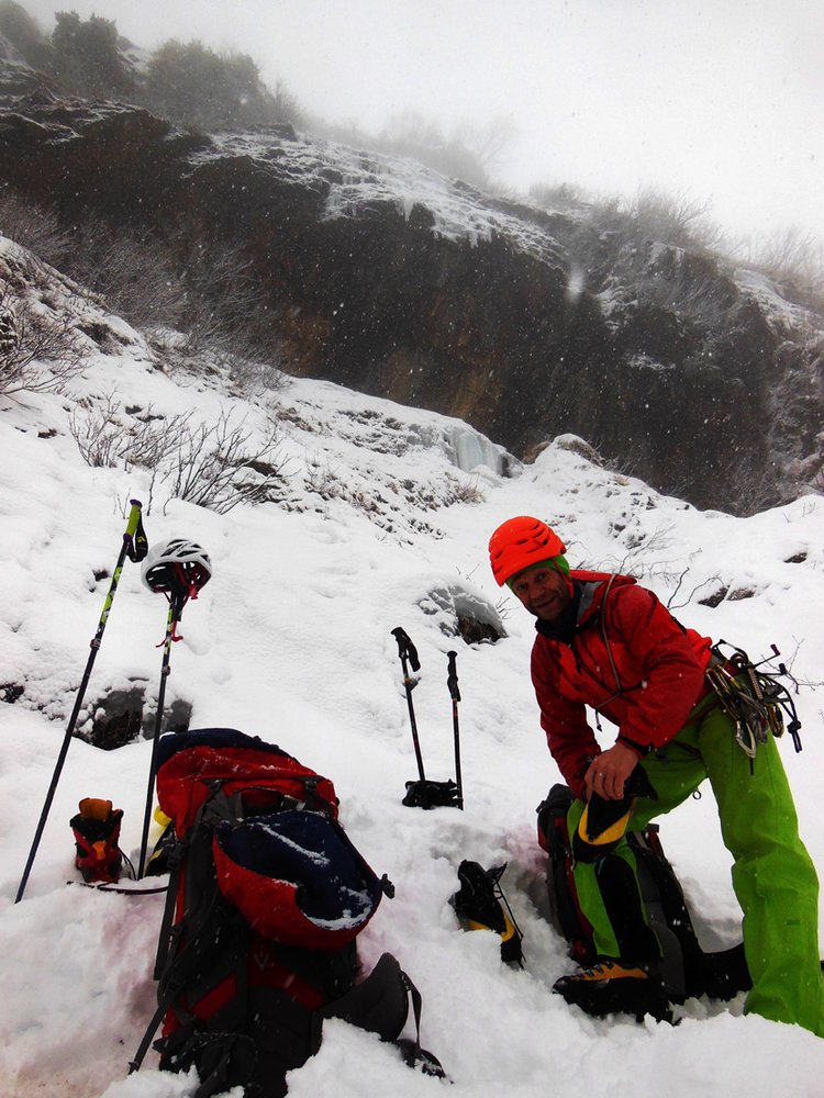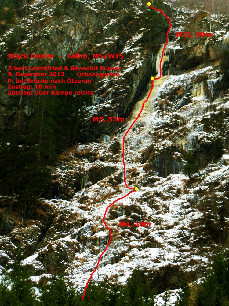 Es begann Anfang Dezember, wo es noch richtig kalt war. Mir fiel eine Linie in meinem Hausgebiet Ochsengarten auf, welche so in der Form noch nie zu beobachten war. Die geringe Schneelage machte es möglich in drei nicht extrem schwierigen, aber interessanten und nicht unspannenden Seillängen in gelblich gefärbten Eis zu klettern. "Black Denim" WI5/M5 fand gleich nach unserer Erstbegehung sehr großen Andrang und die Wiederholungen erreichten in Windeseile den zweistelligen Bereich. So etwas freut mich immer besonders, wenn sich noch viele Leute an unseren Werken erfreuen können.