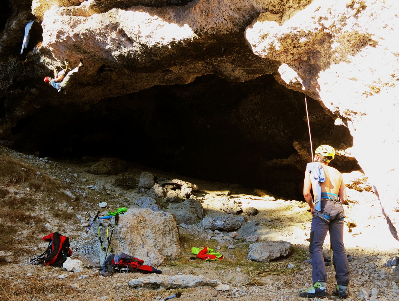 Bald darauf bließ der Föhn zum Angriff und Benny Purner und ich zogen uns in unsere Mixed- und Drytoolhöhlen zurück. Dabei fiel uns eine bereits über Jahre vergessene Route im Dryland ein. Ein altes Projekt von Hannes Mair wartete immer noch wie im Dornröschenschlaf auf die erste Begehung. Nach einigen Stunden des Ausboulderns, Umbohrens bzw. Erweiterns der Route konnten Benny und ich die Route punkten. Sie zeichnet sich durch ihre besondere Athletik aus, ähnlich wie beim Wettkampf gibt es wenig Rastpunkte in dem 15 Meter überhängenden Dach und das Thema figure of four ist immer wieder angesagt um weiter zu kommen. Wir fanden, dass "Figure 443" doch etwas mehr an Ausdauer und Willen fordert als die anderen "schweren" Routen im Dryland - also gaben wir ihr den Grad M13.