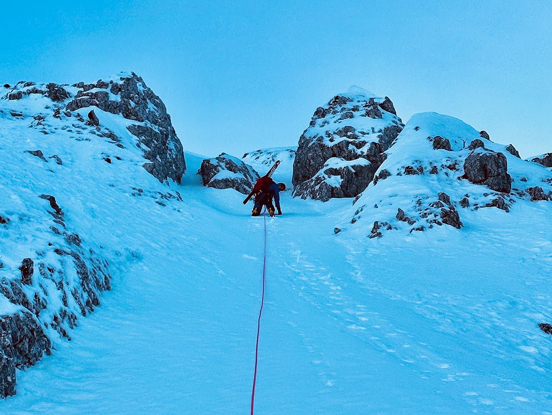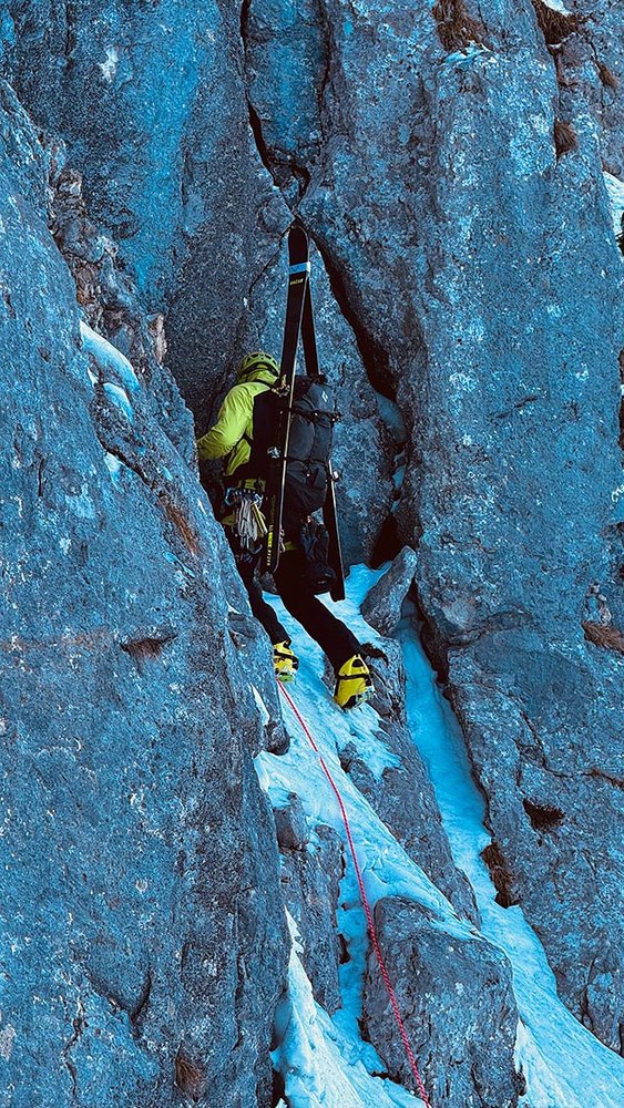 Um sicherzugehen, dass wir uns leicht und schnell fortbewegen können, haben wir unsere Rucksäcke und das Material auf das allernötigste reduziert. Bei 1800 anspruchsvollen Höhenmetern im Aufstieg ist definitiv jedes unnütze Gramm spürbar. Einziger Kompromiss: auf die Rucksäcke geschnallte Tourenski. Im Nachhinein gesehen eine absolut richtige Entscheidung, denn auch wenn die Kletterpassagen mit den Steigeisen auf den Skischuhen um einiges unangenehmer waren, hat sie uns mit großer Wahrscheinlichkeit eine kalte und lange Biwak-Nacht am Gipfel erspart.