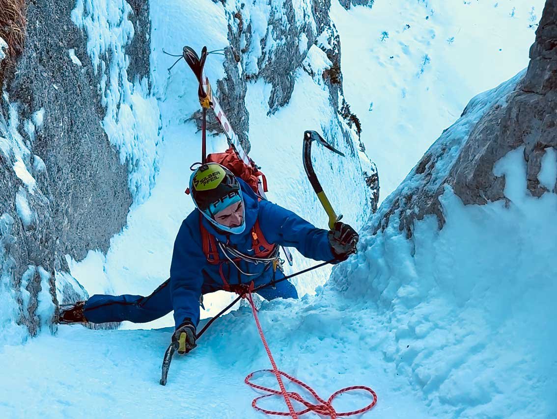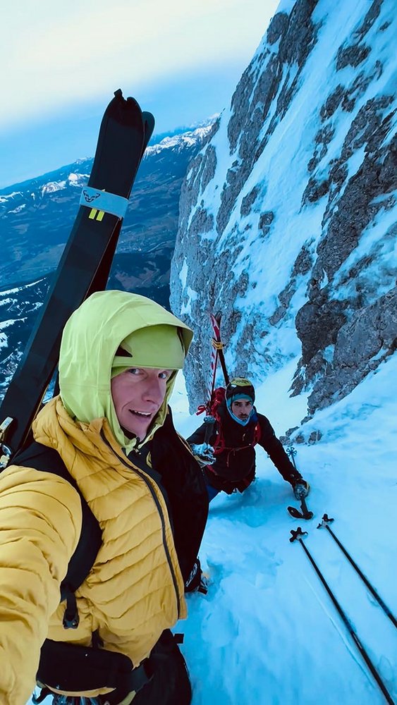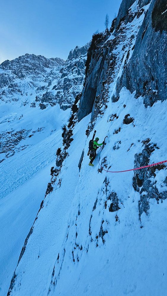 Die nachfolgenden Flanken waren von unterschiedlichsten Schnee- und Eisvarianten geprägt. Besonders die Übergänge zu den Grat- und Felspassagen waren aufgrund des weicheren Schnees teilweise extrem mühsam und tricky. Über die Linienwahl und Co. waren wir uns während der gesamten Route immer zu 100 Prozent einig - Teamwork par excellence!