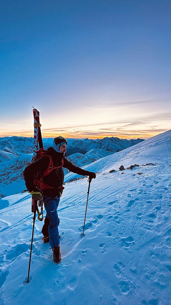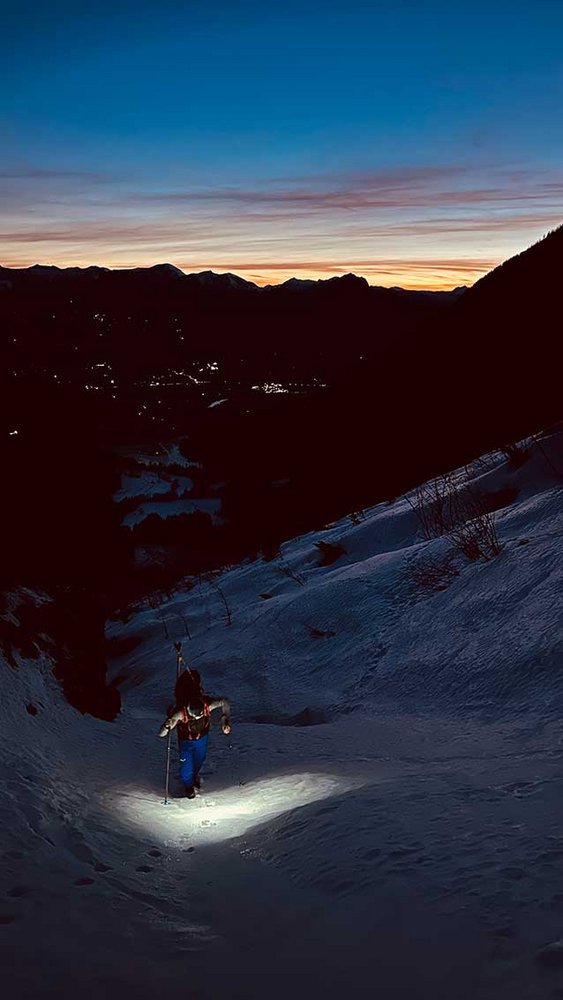 Durch die extrem eisigen Verhältnisse war die Abfahrt weniger "Genuss als Muss“. An lässige Schwünge auf dem Weg ins Tal war mit den leeren Beinen im kleinen Lichtkegel unserer Stirnlampen leider nicht mehr wirklich zu denken. Die letzten 400 Höhenmeter haben wir - aufgrund der geringen Schneeauflage und der unfassbar blanken und eisigen Verhältnisse - zu Fuß und mit Steigeisen zurückgelegt. Wenige Meter zuvor hatte ich noch einen etwas unsanften Steinkontakt, den mein Ski bedauerlicherweise nicht überstanden hat. Kantenbruch, aber glücklicherweise kein Sturz. Wieder einmal eine kleine Erinnerung an ein gutes altes Sprichwort: zu Ende ist es erst, wenn man unten ist!