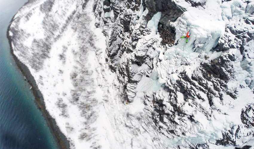 Diese Reise sollte uns nicht nur in neue Landschaften und Eisgebilde führen, sondern auch ein „neuer“ Begleiter mit seiner Kamera war mit uns. Elias Holzknecht – eine junger, motivierter Fotograf aus dem Ötztal ließ sich auf das Abenteuer ein und flog mit uns an die nördlichste Spitze Norwegens, um neue Eindrücke vor der Linse zu sammeln. Wir waren schon alle gespannt, denn auch in der Dokumentation versuchten wir mit einer neuen Technik zu arbeiten. Mit Hilfe einer Drohne konnten wir eine neue Art der Foto- und Filmtechnik für das Eisklettern ausprobieren. Und die Ergebnisse sind atemberaubend. Mit Hilfe eines nicht einmal 2 Kilogramm schweren Fluggerätes mit Elektromotoren und 4 Rotoren ist es möglich Perspektiven zu zeigen, die es bisher noch nicht zu sehen gab.