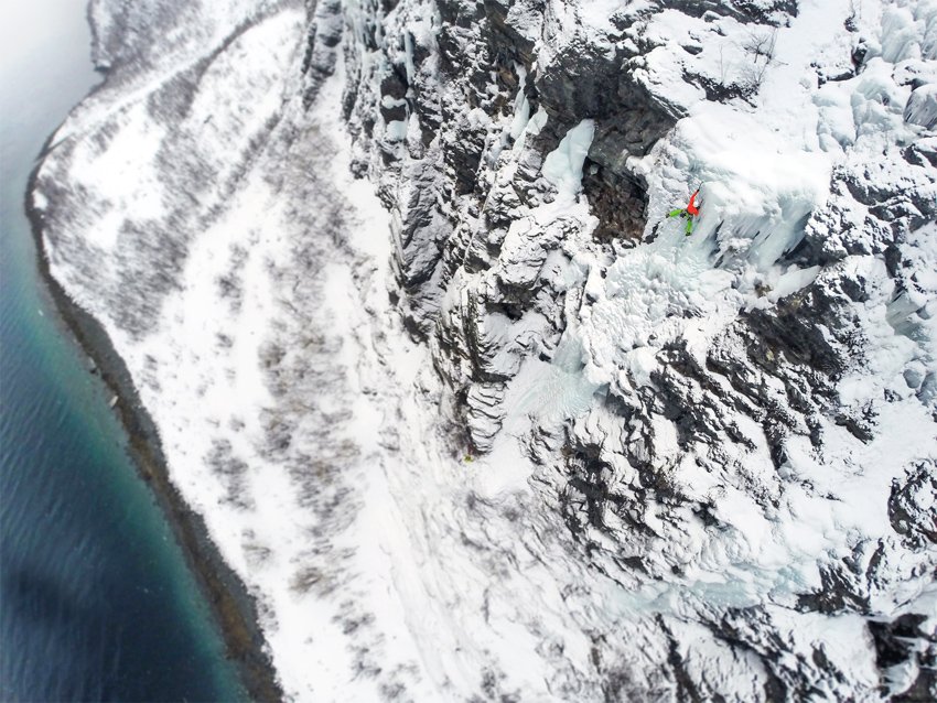 Diese Reise sollte uns nicht nur in neue Landschaften und Eisgebilde führen, sondern auch ein „neuer“ Begleiter mit seiner Kamera war mit uns. Elias Holzknecht – eine junger, motivierter Fotograf aus dem Ötztal ließ sich auf das Abenteuer ein und flog mit uns an die nördlichste Spitze Norwegens, um neue Eindrücke vor der Linse zu sammeln. Wir waren schon alle gespannt, denn auch in der Dokumentation versuchten wir mit einer neuen Technik zu arbeiten. Mit Hilfe einer Drohne konnten wir eine neue Art der Foto- und Filmtechnik für das Eisklettern ausprobieren. Und die Ergebnisse sind atemberaubend. Mit Hilfe eines nicht einmal 2 Kilogramm schweren Fluggerätes mit Elektromotoren und 4 Rotoren ist es möglich Perspektiven zu zeigen, die es bisher noch nicht zu sehen gab.