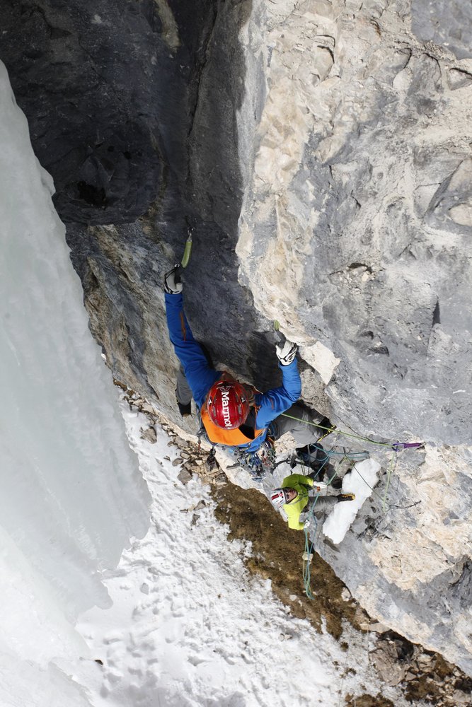 Nun war ich an der Reihe, die Route, wenn möglich weiterhin ohne Eisen zum Eisvorhang zu bringen. Die Felsstrukturen wurden weniger, dafür die Wand noch steiler – eine ernüchternde Kombination. Nach zwei Stürzen, an dem sich abwechselnd jeweils einer meiner zwei gelegten Cam’s aus dem seichten Riss verabschiedeten, waren meine Nerven am Ende. In technischer Kletterei versuchte ich irgendwie zum Zapfen zu gelangen und studierte dabei die Bewegungen und Placements für das nächste Mal.