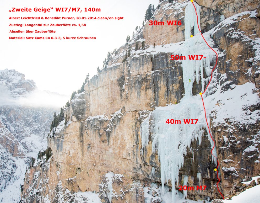 Als Benny mit einem Grinsen im Gesicht zum Stand nachkommt, meinte er nur: „Ein Siebener im Eis ist im Nachstieg doch deutlich angenehmer zu klettern.“ Doch schon in der nächsten Länge muss auch er alles geben. Eine dünne und schlecht abzusichernde Glasur fordert ihn aufs Neue. Als Abschluss wartet noch die freistehende Säule von der Zauberflöte und machen die „Zweite Geige“ zu einer ernsten, aber doch sehr interessanten Linie mit sehr hohem Eisanteil - ohne Bolts und ohne Haken – also clean.