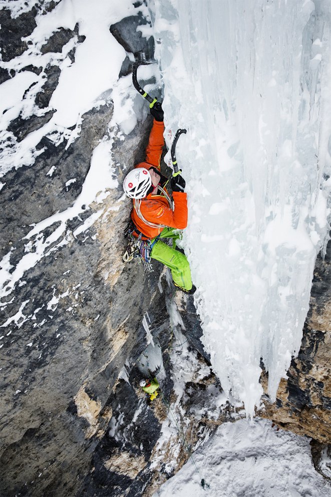 Kurze Zeit später steigt Benny in die erste Seillänge ein, eine abdrängende Rissverschneidung mit bescheidener Felsqualität. Nach 20 Meter und einigen gelegten Cams macht er Stand an einem in der Wand hängenden Zapfen und ich darf die Länge im Nachstieg genießen. Die nächste Runde verläuft umgekehrt – ich habe alle Hände voll zu tun in den frei hängenden Eisformationen. Zum einen ist das Klettern auf dem sehr luftigen und röhrigen Eis technisch schwierig. Zum anderen sollte jede Bewegung gut überlegt sein, an den fragilen und instabilen Eisformationen.