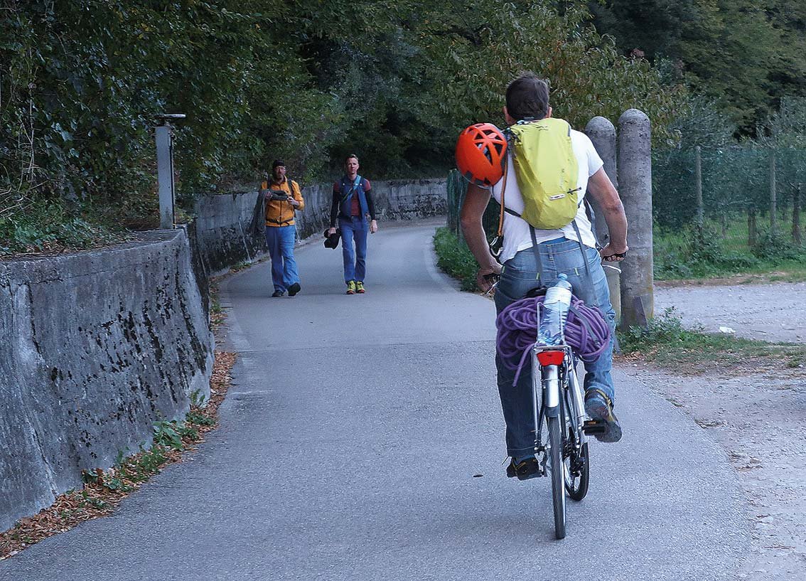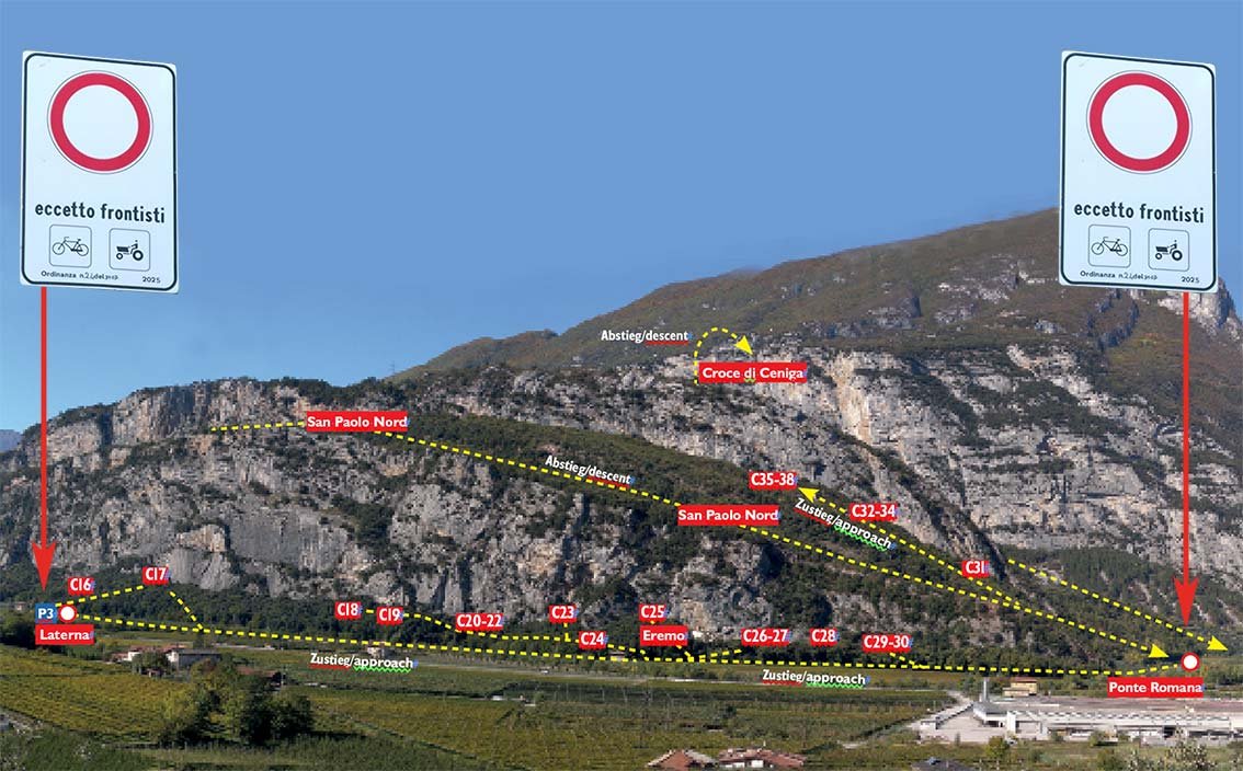 Die Felswände der Parete San Paolo – das sind die Felsen nördlich des Colodri mit den vielen, sehr beliebten Mehrseillängentouren – waren bis dato einfach über die unterhalb der Felsen verlaufende Straße erreichbar. Es gab einige Parkplätze - beim Wasserkraftwerk, bei der Einsiedelei (Eremo) und beim Abstiegsweg. Diese Straße, Via dei Legionari Cecoslovacchi wurde auch gerne von Wildcampern genutzt, die es sich am Abend an den Parkplätzen gemütlich machten.