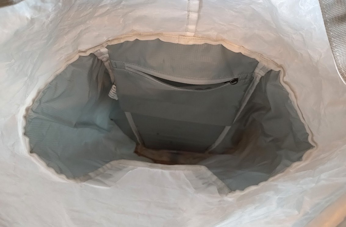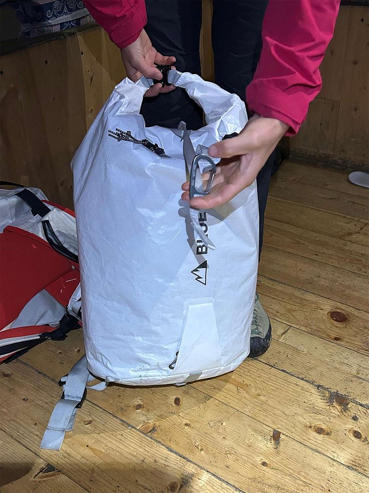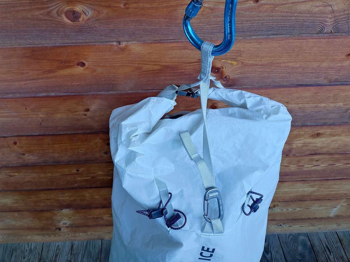 Es gibt im bzw. am Alpin Hauler nur eine Tasche mit Reißverschluss, diese liegt innen im Rucksack. Die Pickelbefestigung ist sehr gut, die Geräte für Eis und Schnee haben bei uns immer gut gehalten, die Klingen kann man überkreuzt in einem Aluula-Einschubfach schützen. Der Rollverschluss an der Hauptöffnung ist auch mit einer speziellen Schnalle ausgestattet und top. Das extrem leichte Aluula-Gewebe macht den Rucksack Innenraum angenehm hell, naturgemäß werden weiße Rucksäcke außen schneller dreckig als schwarze (der Dreck ist derselbe, auf Weiß sieht man diesen aber besser).