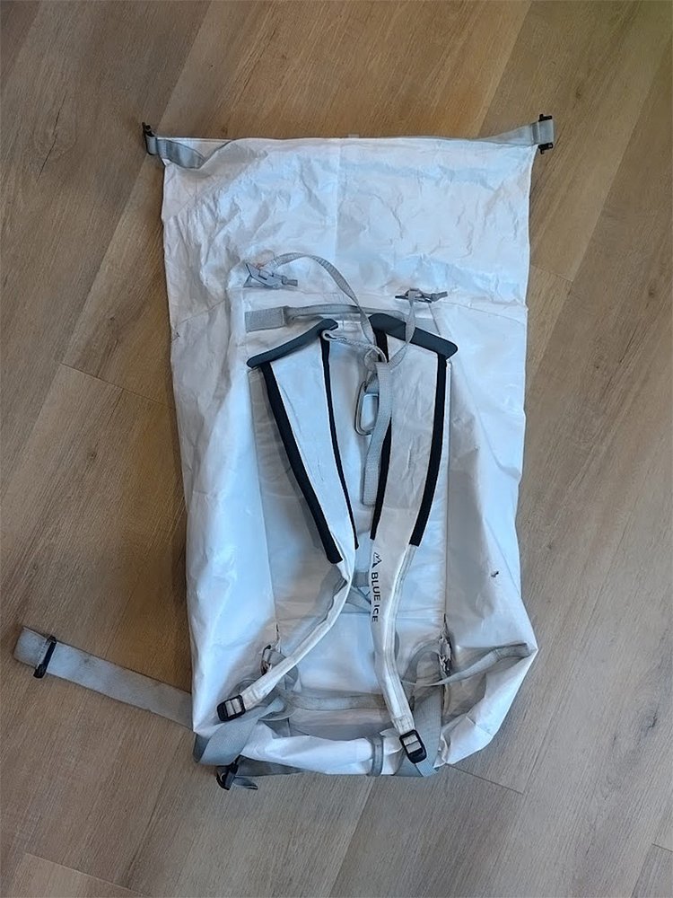 Auf den ersten Blick schaut der Blue Ice Alpine Hauler Rucksack etwas unförmig aus und das Außenmaterial raschelt im Neuzustand etwas ungewohnt. Der Alpine Hauler ist ein im Volumen sehr flexibler Rucksack, komplett ausgefahren gehen gute 45 Liter in den weißen Sack. Wenn ganz voll gestopft kann man den Alpin Hauler oben mit der Haulschlinge verschließen, man muss ihn nicht einrollen und gewinnt noch etwas mehr Platz. Die Schulterträger sind gepolstert, der Tragekomfort könnte aber - nur bei voller, schwerer Füllung - etwas besser sein.