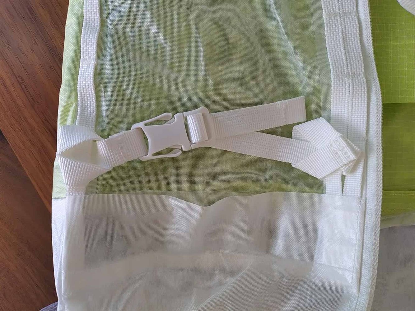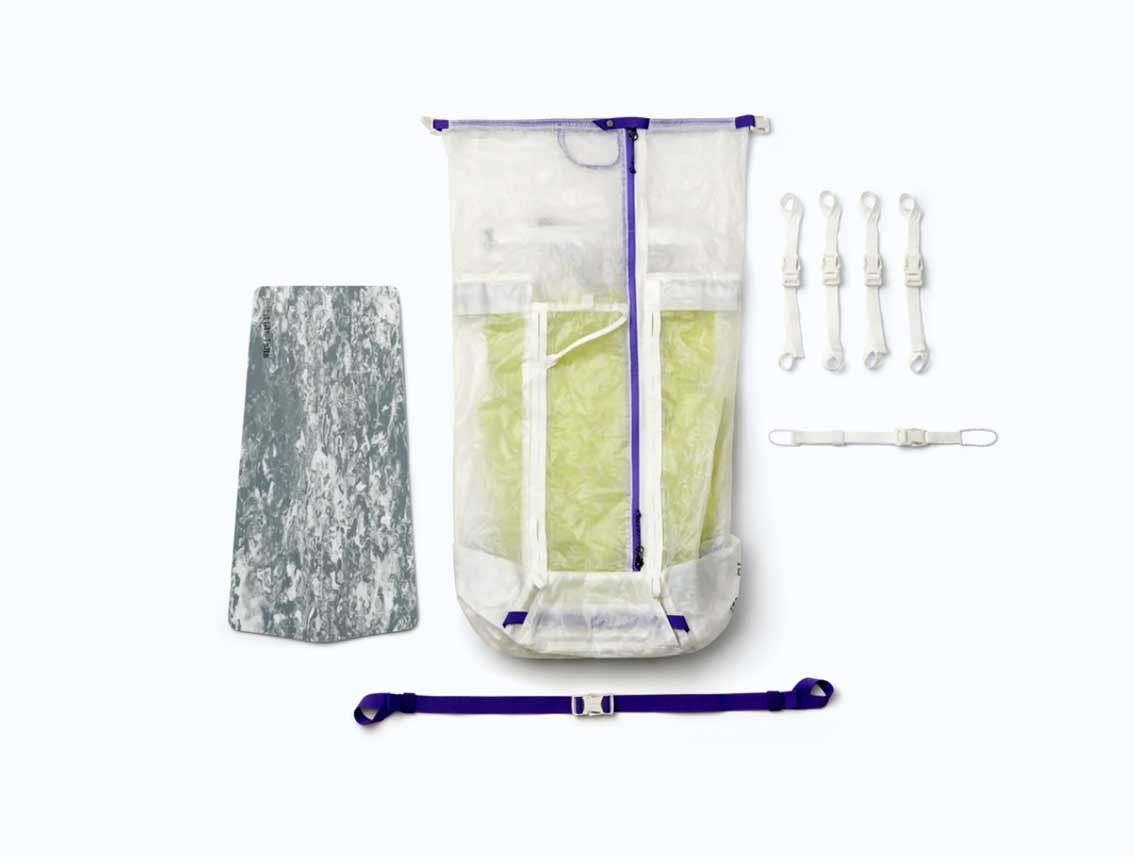 Der DB Weigh Lighter Backpack 25L unterscheidet sich durch eine weitere Eigenschaft von anderen Dyneema-Rucksäcken: Sein Gewebe ist leicht transparent. Das sieht gut aus und hat den Vorteil, dass man größere, markante Gegenstände wie z. B. den Kletterhelm von außen erkennen kann – komplett durchsichtig ist das Material jedoch nicht. Das Aluula-Gewebe des Weigh Lighter Backpack 25L ist außerdem deutlich dünner als z. B. jenes des Blue Ice Alpine Hauler und knistert auch nicht so stark.
