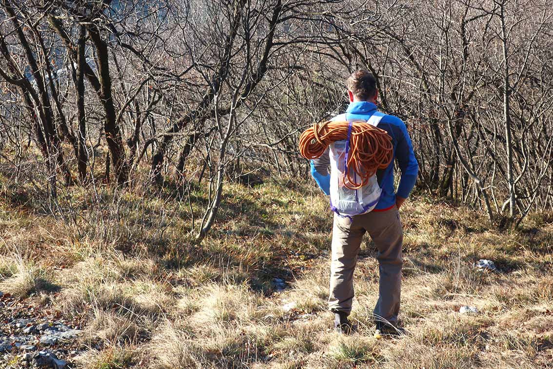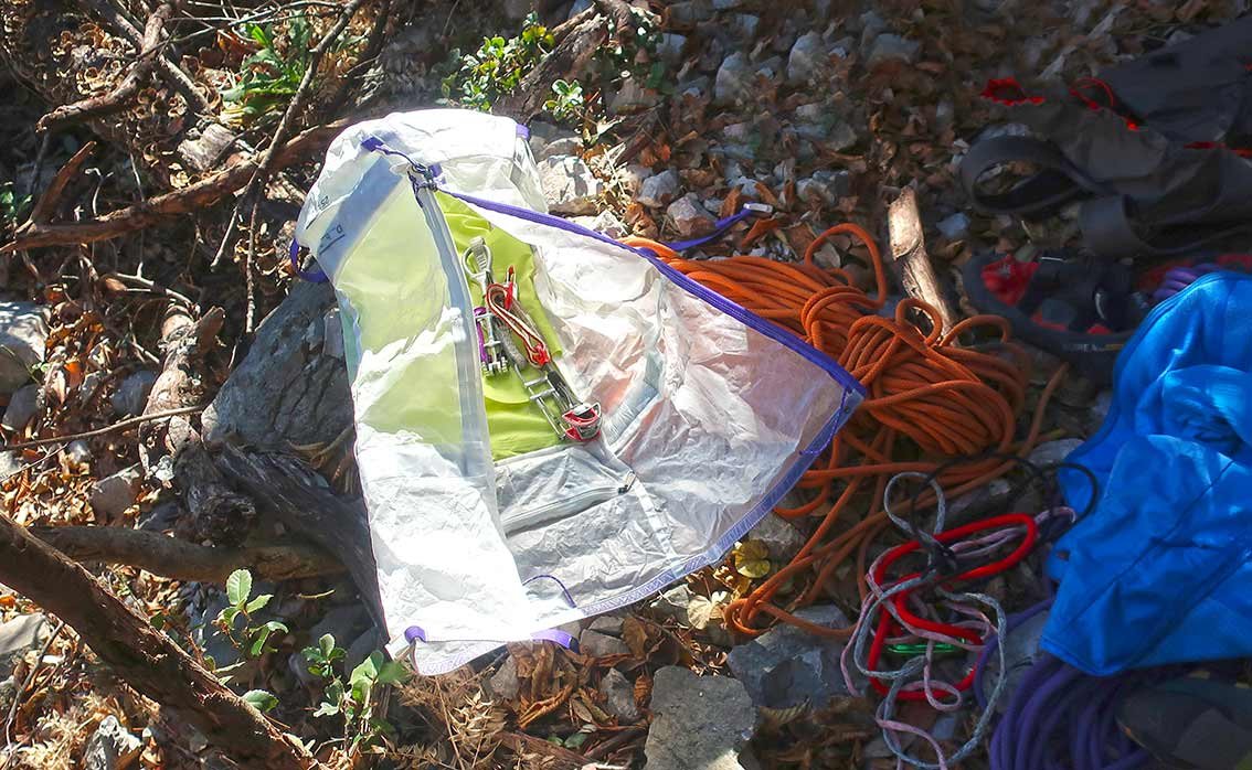 Besonders positiv fällt der DB-Rucksack beim Klettern auf: Nur mit Kletterschuhen und eventuell einer Windjacke gefüllt, spürt man ihn überhaupt nicht (wir dachten anfangs sogar, er läge noch am Einstieg). Außen gibt es ausreichend Schlaufen für Karabiner, Seilbefestigung etc. – mehr braucht man zum Klettern nicht. Auf Skitouren hatten wir den DB Weigh Lighter Backpack ebenfalls schon im Einsatz; dabei passt auch ein Skitourenhelm gut hinein (was nicht bei allen leichten Skitourenrucksäcken der Fall ist). Wir sehen den Weigh Lighter Backpack 25 primär beim Klettern und Alpinklettern, vermutlich macht der Rucksack aber auch auf anspruchsvollen Hochtouren eine sehr gute Figur.
