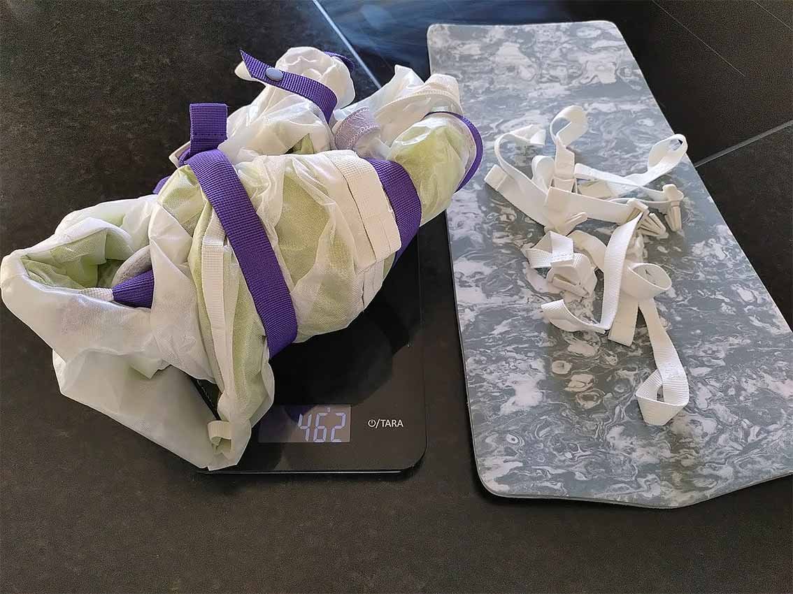 Unser Weigh Lighter Backpack 25L kommt „ohne alles“, aber mit Hüftgurt, auf 460 Gramm. Wir haben jedoch den leichten Schaumstoffrückenteil (59 Gramm) wieder eingebaut – so spürt man nicht jeden schlecht im Rucksack liegenden Friend an der Wirbelsäule. An den Schulterträgern befinden sich zudem zwei größere Schnallen, mit denen sich der Weigh Lighter Backpack z. B. an einem DB-Skisack befestigen lässt. Wir haben sie montiert gelassen, man könnte sie aber auch wegschneiden. Die Schulterträger sind angenehm gepolstert, und der Rucksack liegt auch voll beladen sehr gut am Rücken.