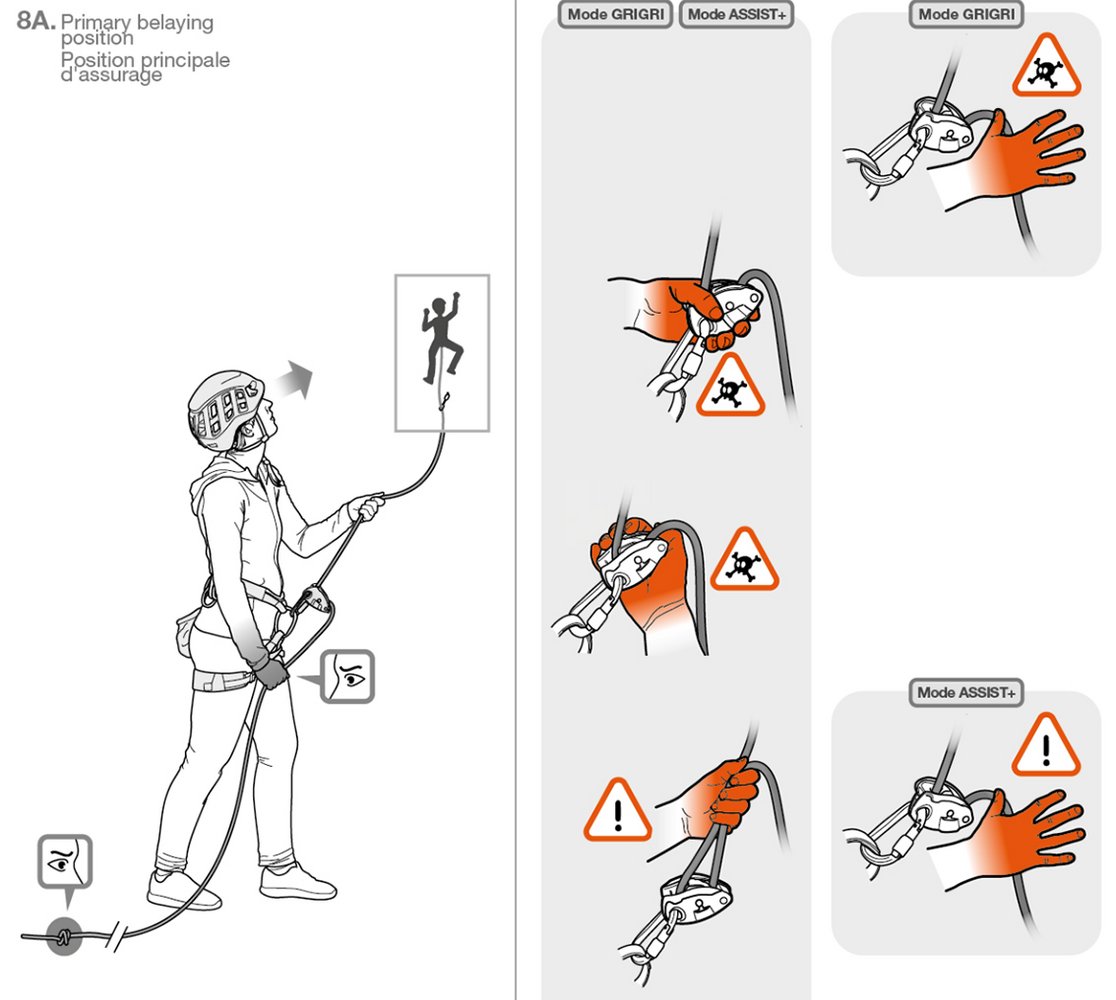 Ein Blick in die Gebrauchsanweisung verrät auch den Sicherheitsvorteil des Top-Rope-Modus (im Manual als Mode Assist + bezeichnet). Da ist zum ersten Mal nur ein rotes Rufezeichen und eine rote Hand, was natürlich auch suggeriert, dass man die Hand nicht vom Seil nehmen soll. Es ist aber kein Totenkopf daneben, dieser ist nur im Mode Grigri - also bei nicht in den Toprope Modus umgestellten Gerät - zu finden. Also ist das Grigri + im Top-Rope-Modus (Mode Assist +) durch die Klemmwirkung sicherer als andere Halbautomaten beim Toprope-Klettern.