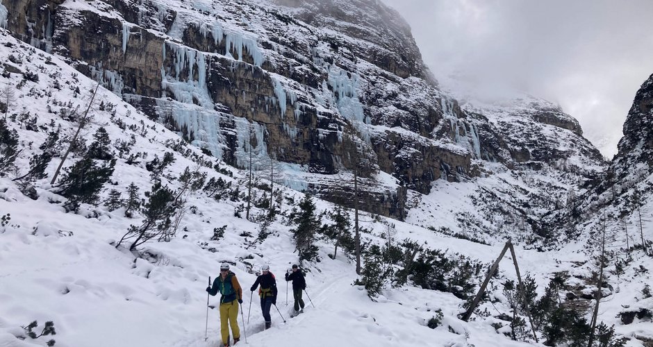 Begehen von Eisfällen und kombinierten Routen. Je nach Bedingungen sind auch Winterbegehungen von moderaten Felsrouten und Skitouren möglich.