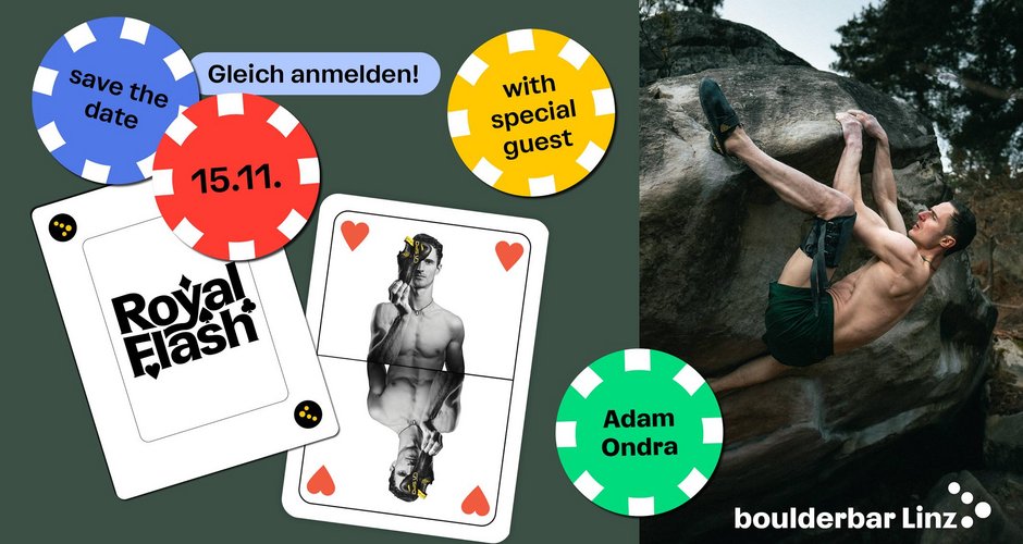 Für 30€ Startgebühr bekommst du nicht nur ein tolles T-Shirt und einen aufregenden Tag voller Action in der boulderbar Linz, sondern hast auch automatisch einen Platz beim Rahmenprogramm mit Adam Ondra sicher. Die Startplätze sind jedoch begrenzt. Melde dich also schnell über unsere Website an und sei dabei, wenn es wieder heißt: Royal Flash!