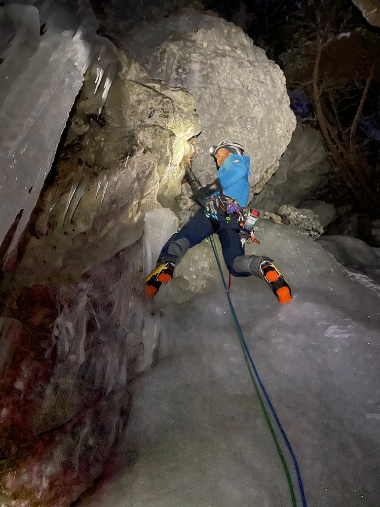 Komplette Eis- und Mixedkletterausrüstung. Felsteil ist gebohrt, am Ende ist ein Abseiler eingerichtet.