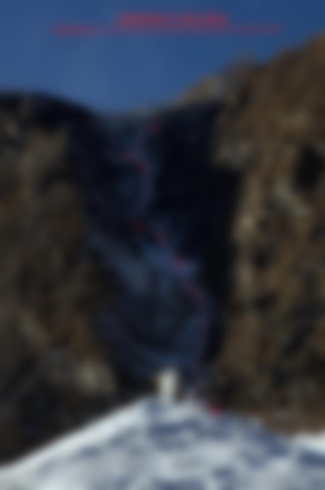 2.Seillänge…kurze Steilstufe ins Flachstück teils Eis und gepresster Schnee (Lawinen) hinauf zu Felsecke rechts, Felsstand (1NH+1Snark mit Seilschlinge belassen…Wi1/50m).