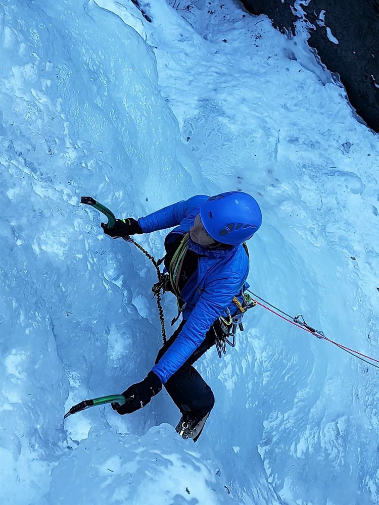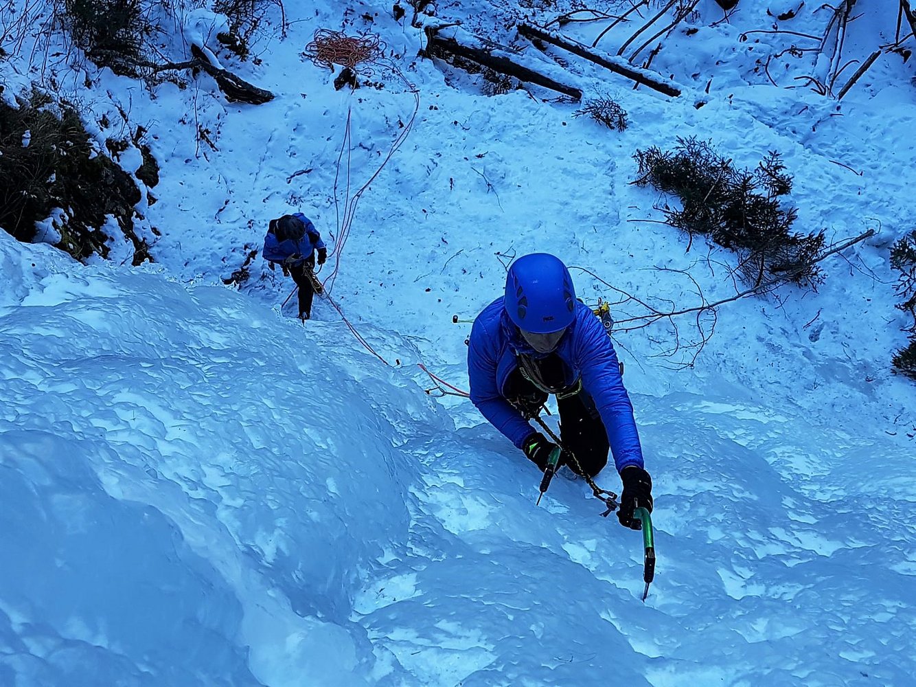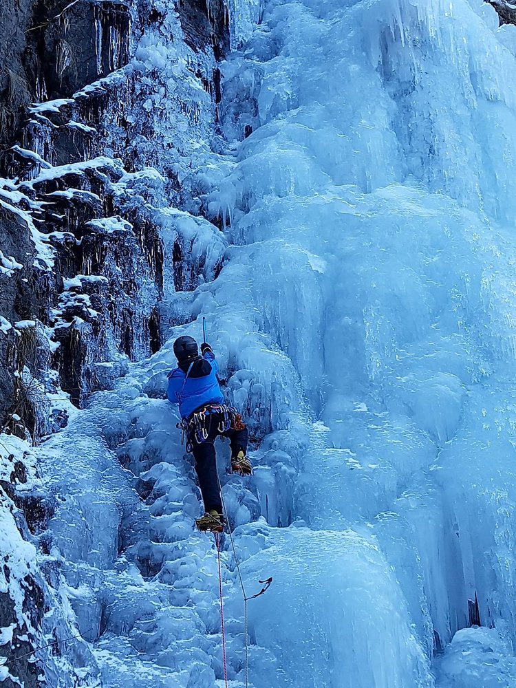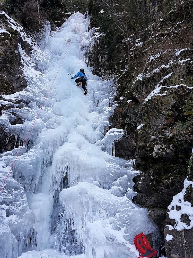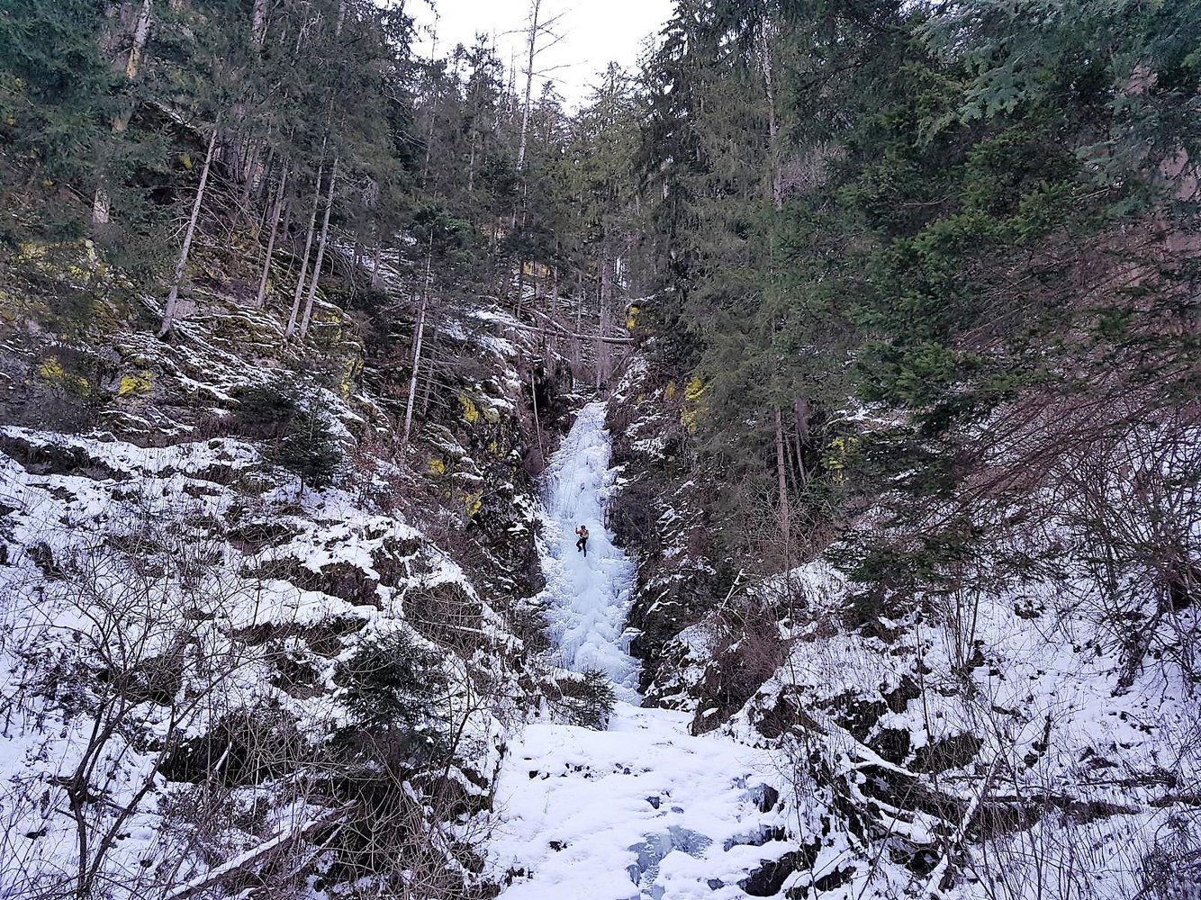Die „Fuchsfarm“ ist ein schöner gestufter Eisfall, bei dem sich schöne Eislängen und Gehelände immer wieder abwechseln. Guter Eisfall für Anfänger, jedoch gar nicht so kurz. Vernachlässigbare Lawinengefahr.