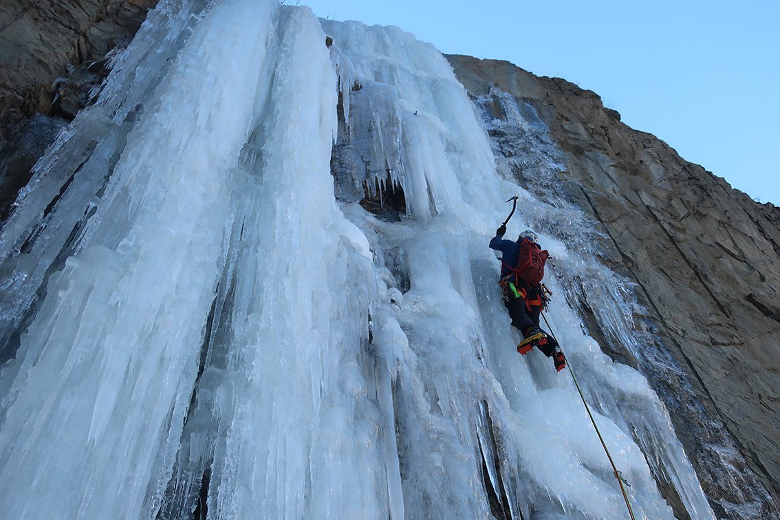 Blick von unten in die zweite Seillänge - Gelber Fluss Eisfall im hinteren Kaunertal