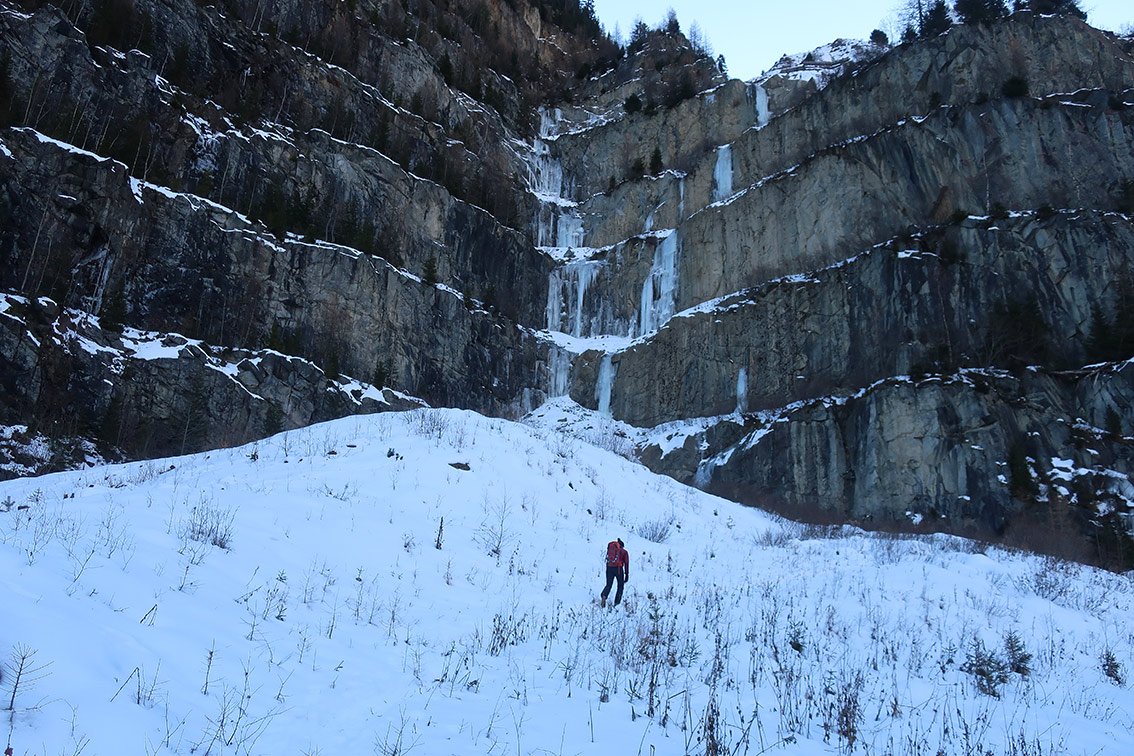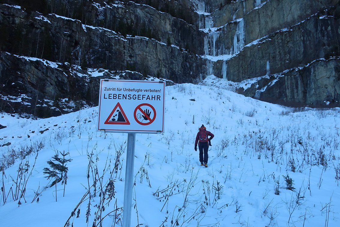 Bei viel Schnee kann die Lawinengefahr beim Ausqueren am Ende der Route und beim Fußabstieg ein großes Thema sein (steil!).