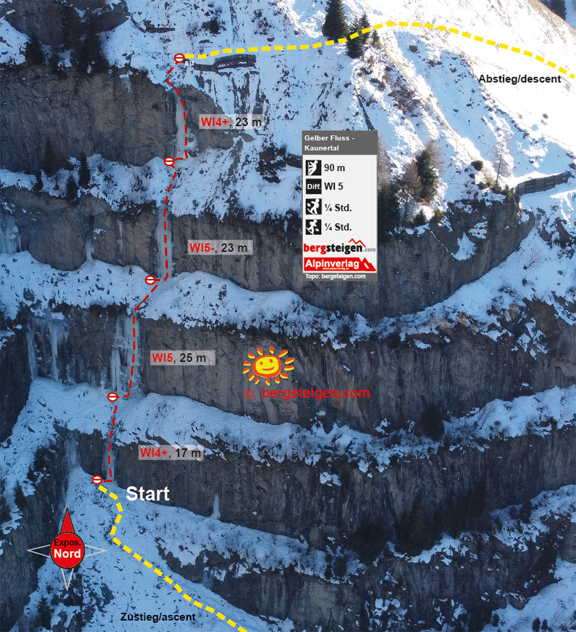 Der Gelbe Fluss ist laut der Kaunertalwebseite eine der Top 3 Eisklettertouren im Kaunertal. Nimmt man den Umstand des Klimawandels hinzu, könnte das evtl. sogar hinkommen, da der Fall recht weit oben und nordseitig gelegen ist. Wenn andere Eisfälle unten im Tal noch wenig bis gar keine Eisauflage haben, kann man im Steinbruch unterhalb der Staumauer oft schon recht passabel klettern. Die vier Steilstufen schauen von weitem recht harmlos aus, vor allem aber die mittleren beiden Stufen können ganz schön "pumpig" werden.