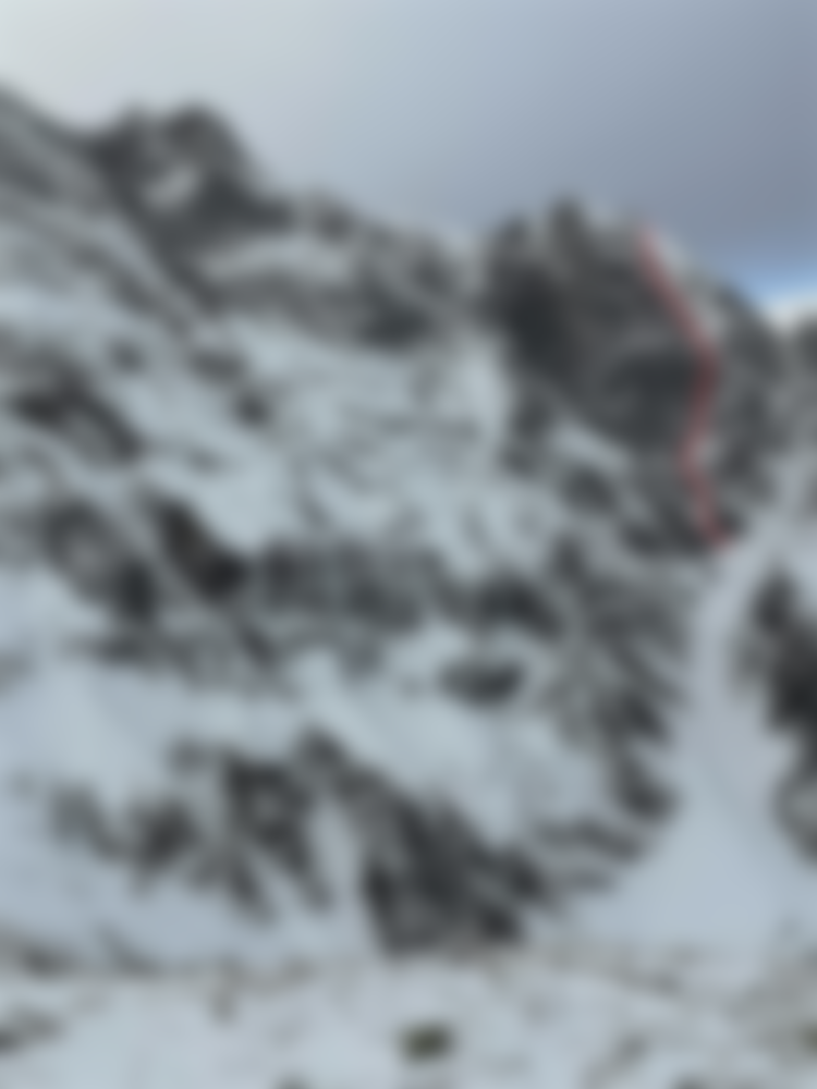 2. Dem Nordnordwestgrat folgend über Schnee und Platten bis kurz vor den Abbruch, der zur Scharte abfällt, von der nach Nordosten die markante Rinne zum Wandfuß abzweigt. An Abseilstand (Keil und NH belassen, mit Friend hintersichern) 25 m in die Scharte abseilen. Der Rinne abwärts nach Nordosten folgen. Ein weiterer eingerichteter Abseiler führt in leichteres Gelände.