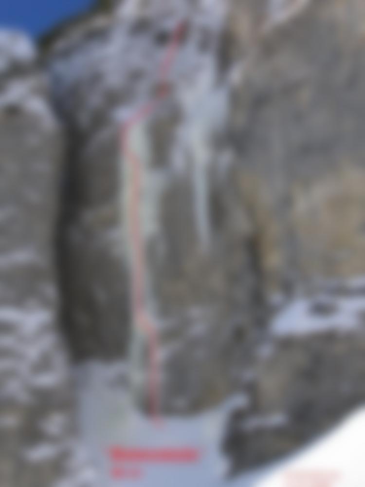 Bei der Erstbegehung war die Säule bis zum Einstieg gewachsen und es war eine reine Eistour, Absicherung mittells Eisschrauben. Wenn dies nicht der Fall ist, ist der untere Bereich Mixedgelände (nicht eingebohrt, Schwierigkeit nicht bekannt).