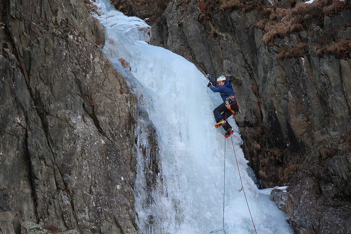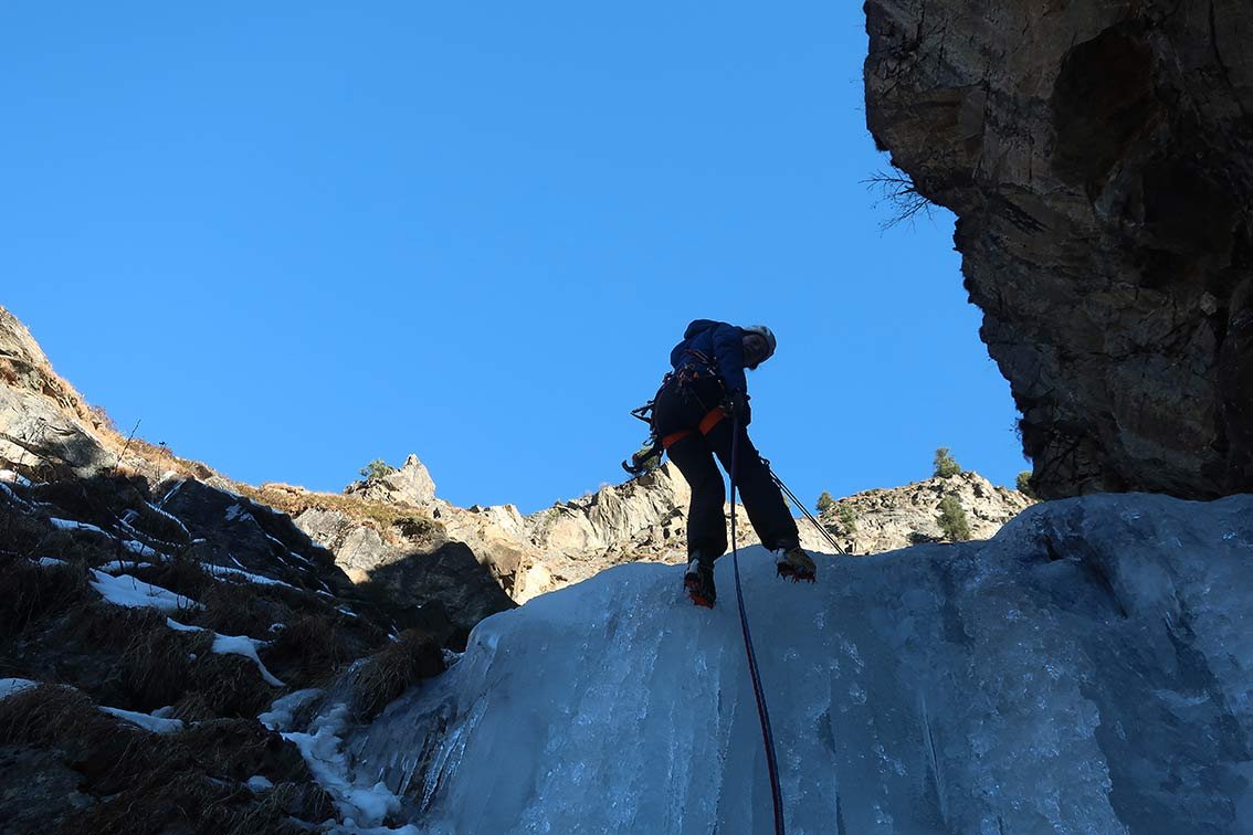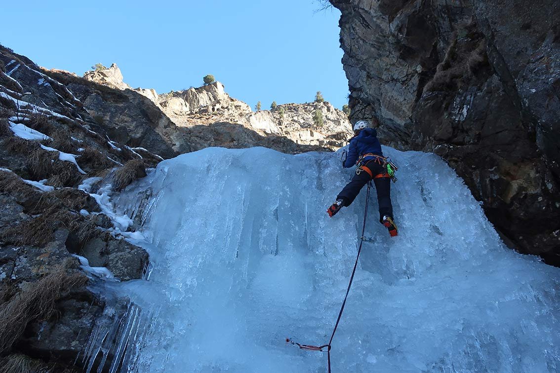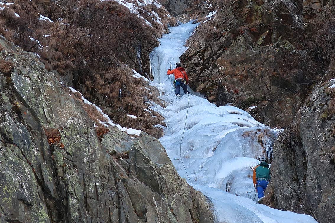Eine Tour für Leute, die auch an flacheren Eispassagen in einer landschaftlich schönen Rinne Spaß haben. Mehrere Aufschwünge bis WI3+ und oben WI4.