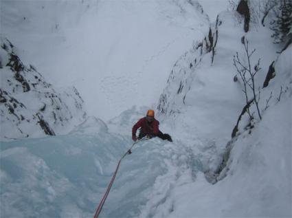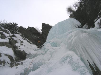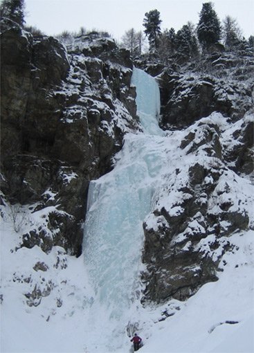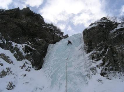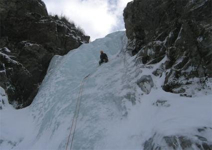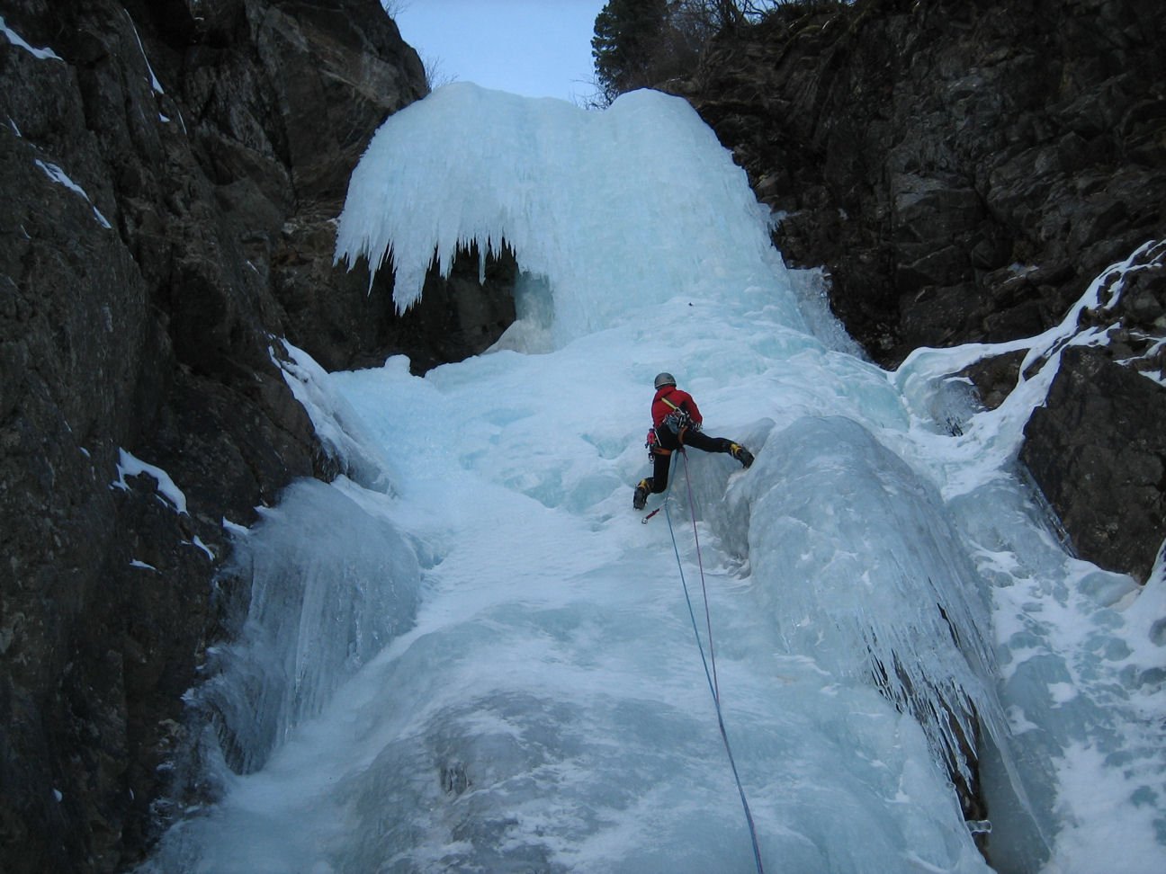 Schwerer und schöner Eisfall hoch oben über der Sellrainstraße. Durch den steilen Zustieg nur bei sicheren Schneeverhältnissen interessant.
