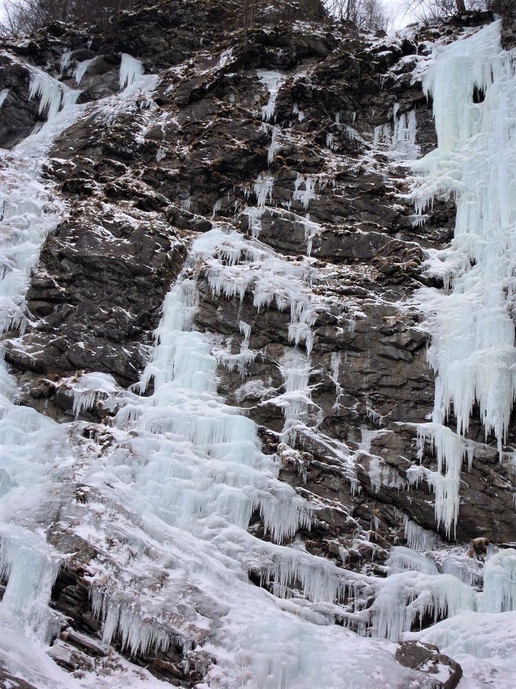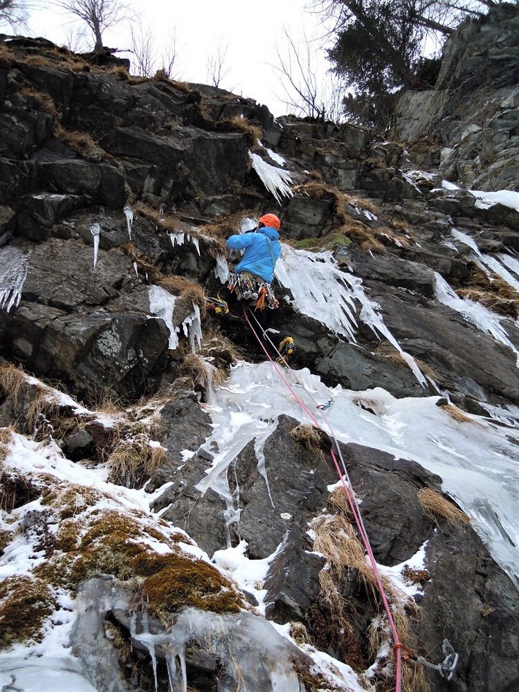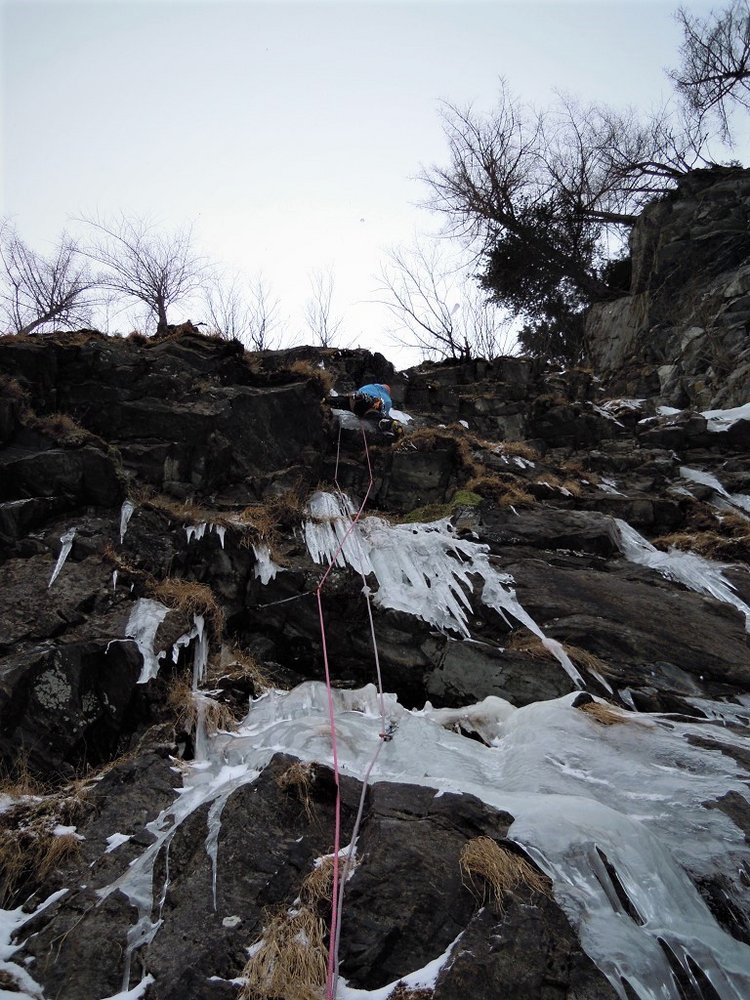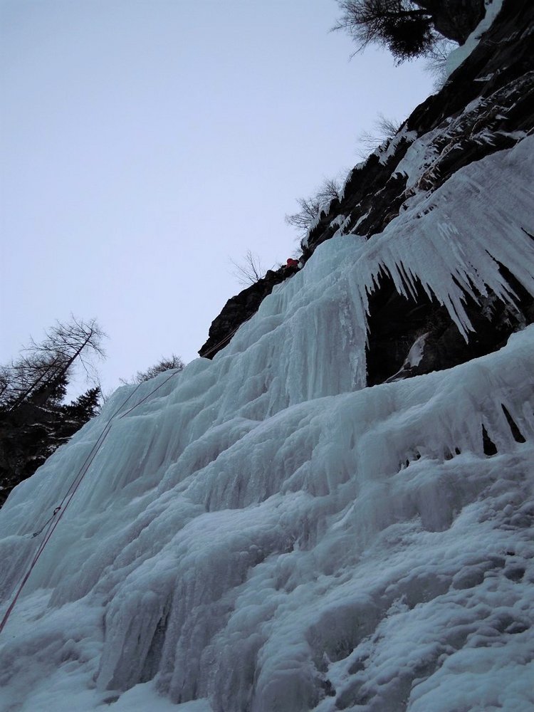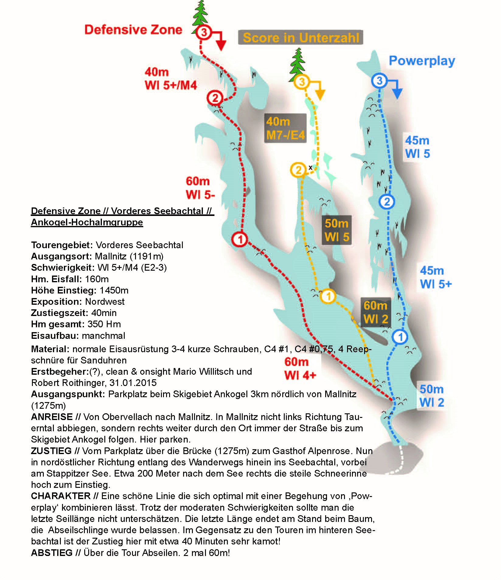 Gewagte Linie, deren Schlüssellänge nicht immer festen Fels zu bieten hat. Trotz der mäßigen technischen Schwierigkeiten, sehr anspruchsvoll zu klettern und abzusichern. Bei unserer Begehung fanden wir am Ende der 2.Seillänge einen Bohrhakenstand mit Karabiner vor. Wir nutzten diesen als erste Zwischensicherung der Mixed-Linie so wie zum Abseilen. Die dritte Länge endet an einem Baum, die Abseilschlinge wurde belassen. Im Gegensatz zu den Touren im hinteren Seebachtal ist der Zustieg hier mit etwa 40 Minuten sehr kamot!