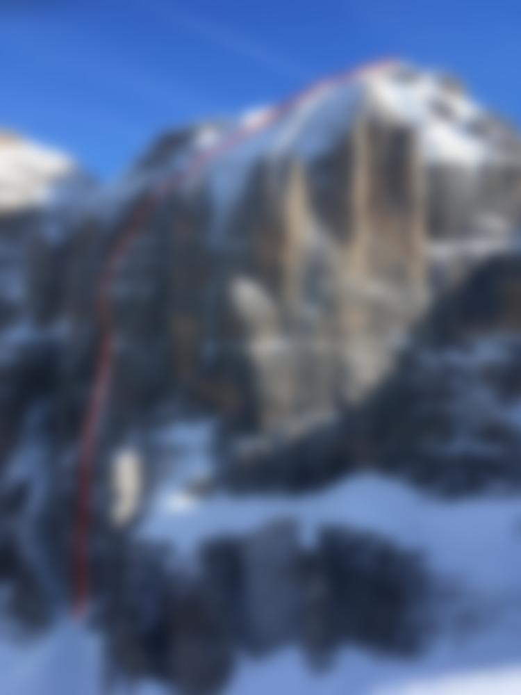 Am 1.1.2019 kletterten Ines Papert und Luka Lindič einen direkten (im Topo rot) Weg zum Gipfel, der mehr im schwierig abzusicherenden Eis verläuft. Einen Bericht mit mehr Bildern über diese Begehung findet ihr bei uns hier