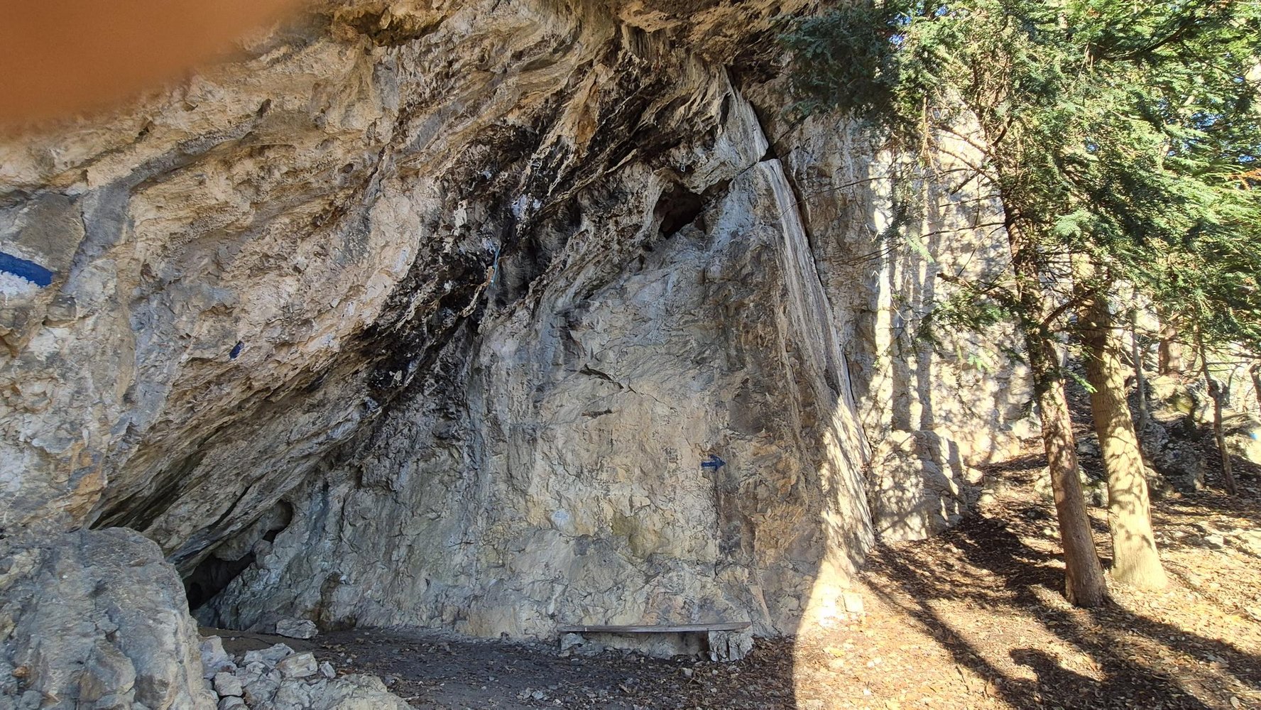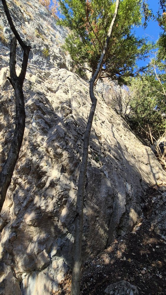 Kleiner Klettergarten bei einem großen Brandloch (Höhle) rechts vom Tirolersteig. Die Routen sind durchwegs kurz bis sehr kurz, stark überhängende oder senkrechte plattig (im rechten Teil des Klettergartens). Die Bäume spenden auch im Sommer etwas Schatten. Die meisten Routen sind angeschrieben.