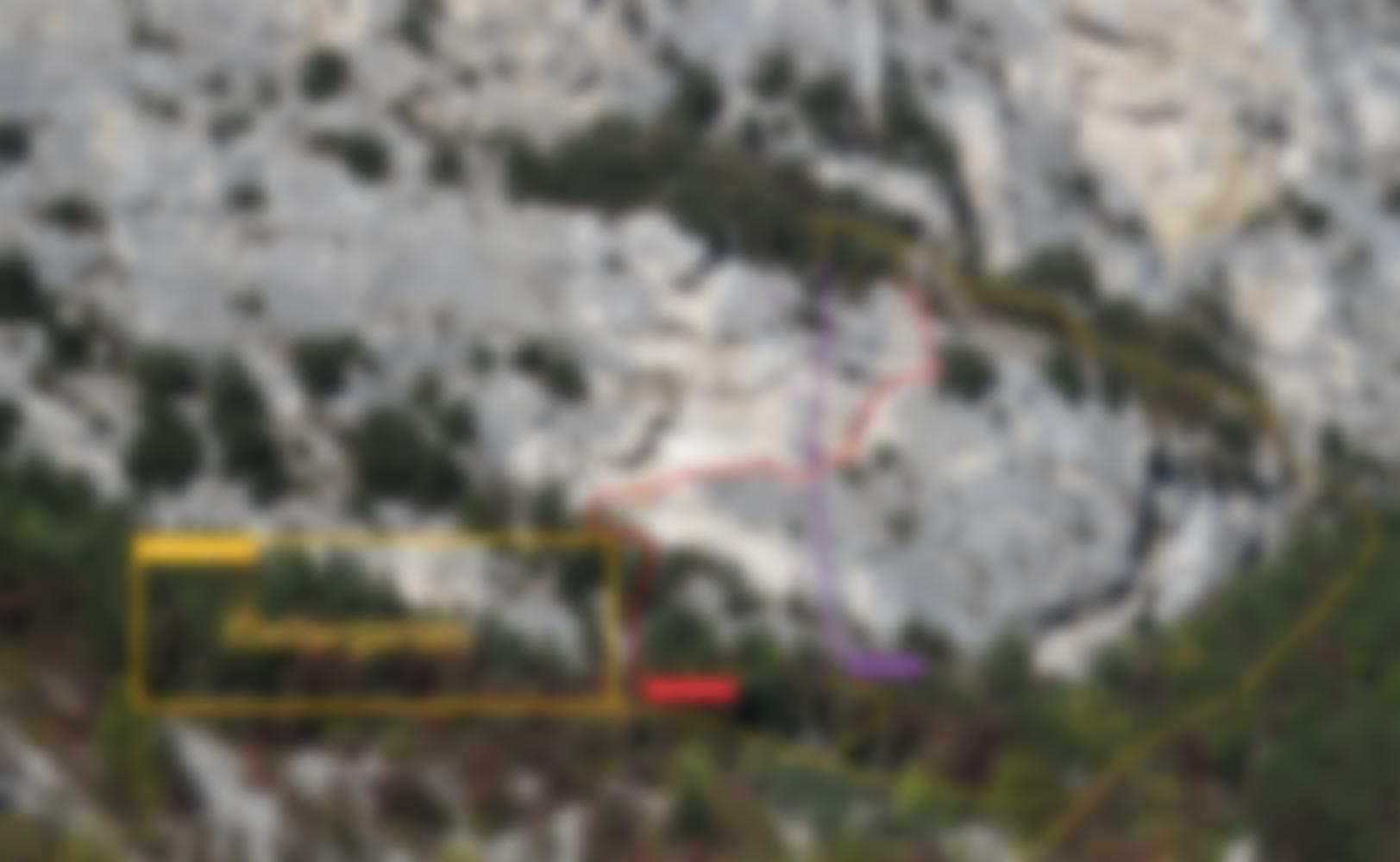 Vom Parkplatz auf der Straße Richtung Bauernhof „Maso Lizzone“ und davor links abzweigen (Wegweiser Wanderweg Nr. 428 „Sentiero degli Scaloni). Dem markierten Weg bis unter die Wand folgen und auf gutem Pfad am Wandfuss nach links zum Klettergarten abzweigen. Der Einstieg ist bei rechtesten Tour (Rote Schrift).