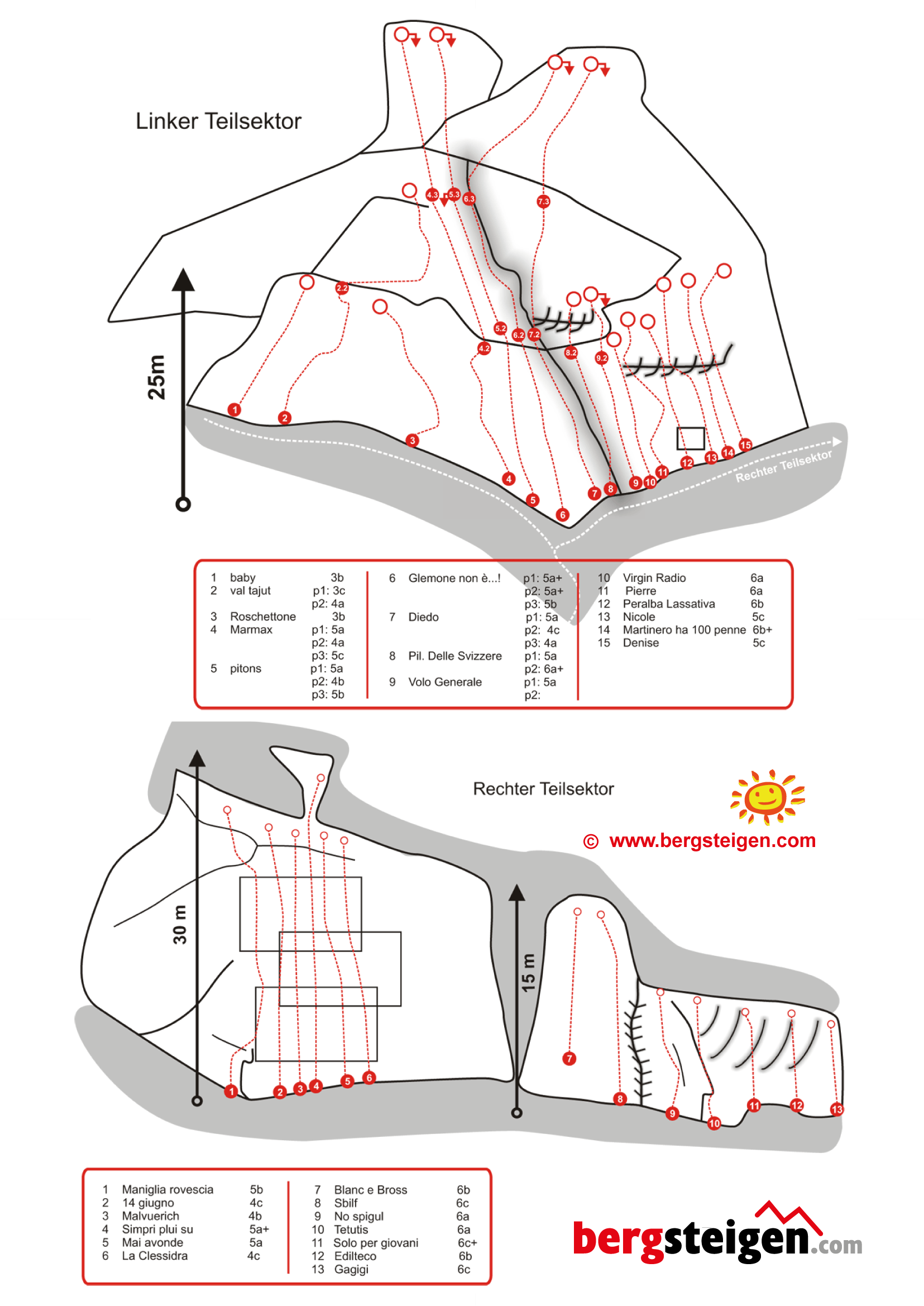 Der Obere Sektor im Val Romana ist ebenso wie der Untere Sektor sehr gut mit Klebehaken und Standplätzen ausgestattet. Im Gegensatz zum Unteren Sektor sind die Touren hier etwas plattiger und es gibt mehrere einfache Mehrseillängentouren. Diese eigenen sich gut, den Seilschaftsablauf zu erlernen. Die plattige und technische Kletterei am rauen Kalk wird durch das herrliche Ambiente und die Einsamkeit im Val Romana ergänzt.