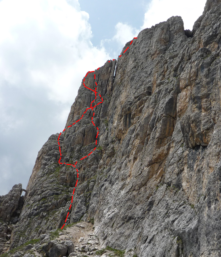 Anstelle des Abstieges über den Normalweg zum Sellajoch empfiehlt sich die Kombination mit der Kostner Verschneidung in der SW Wand d. 2. Sellaturms.