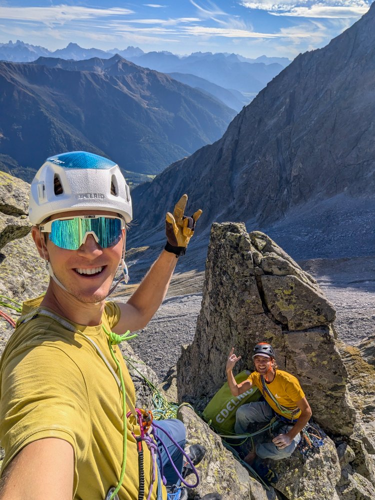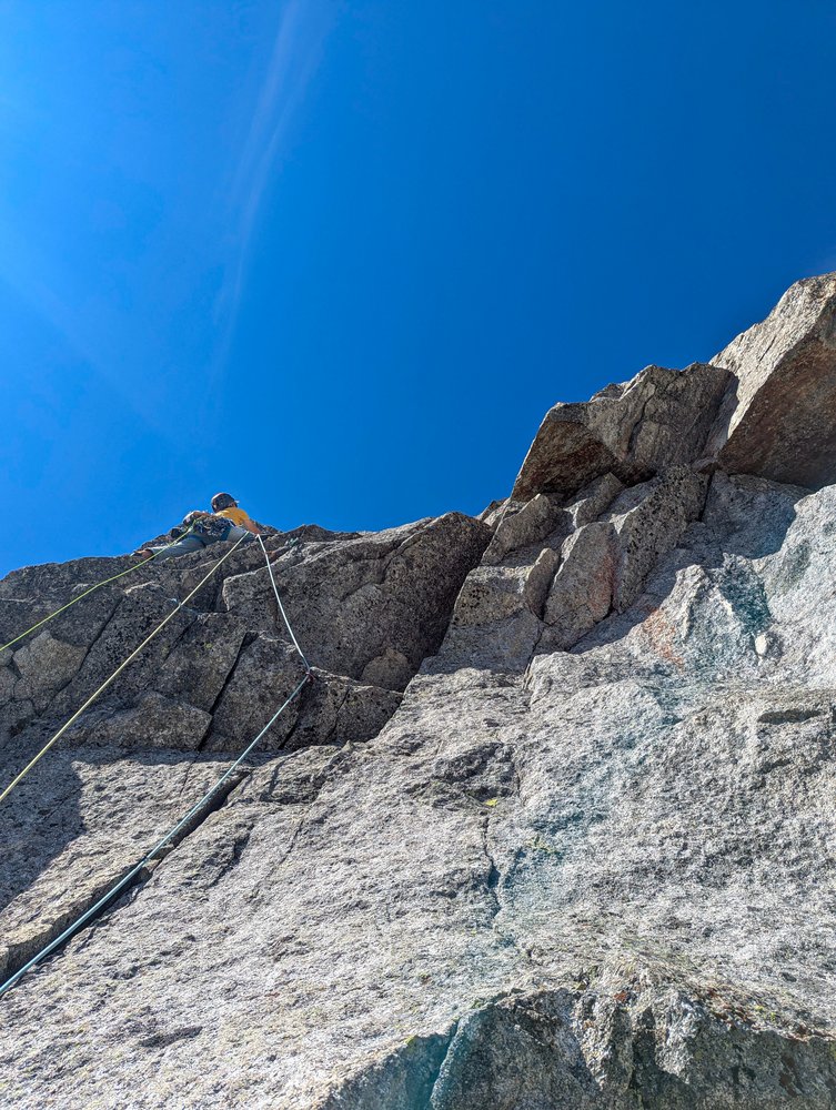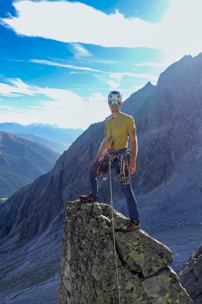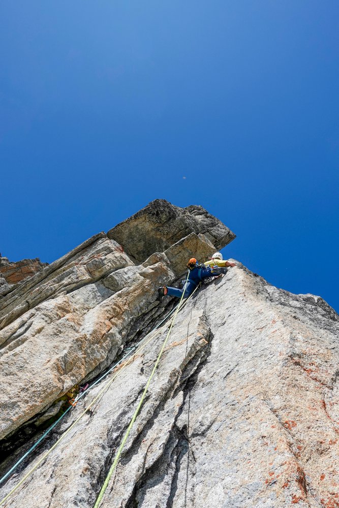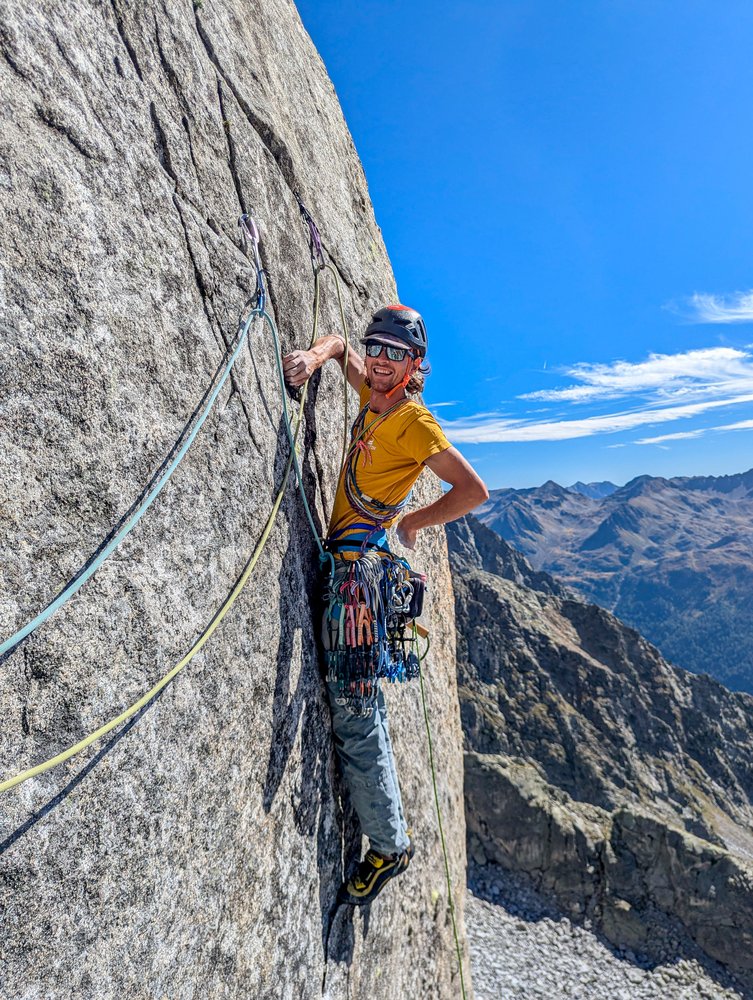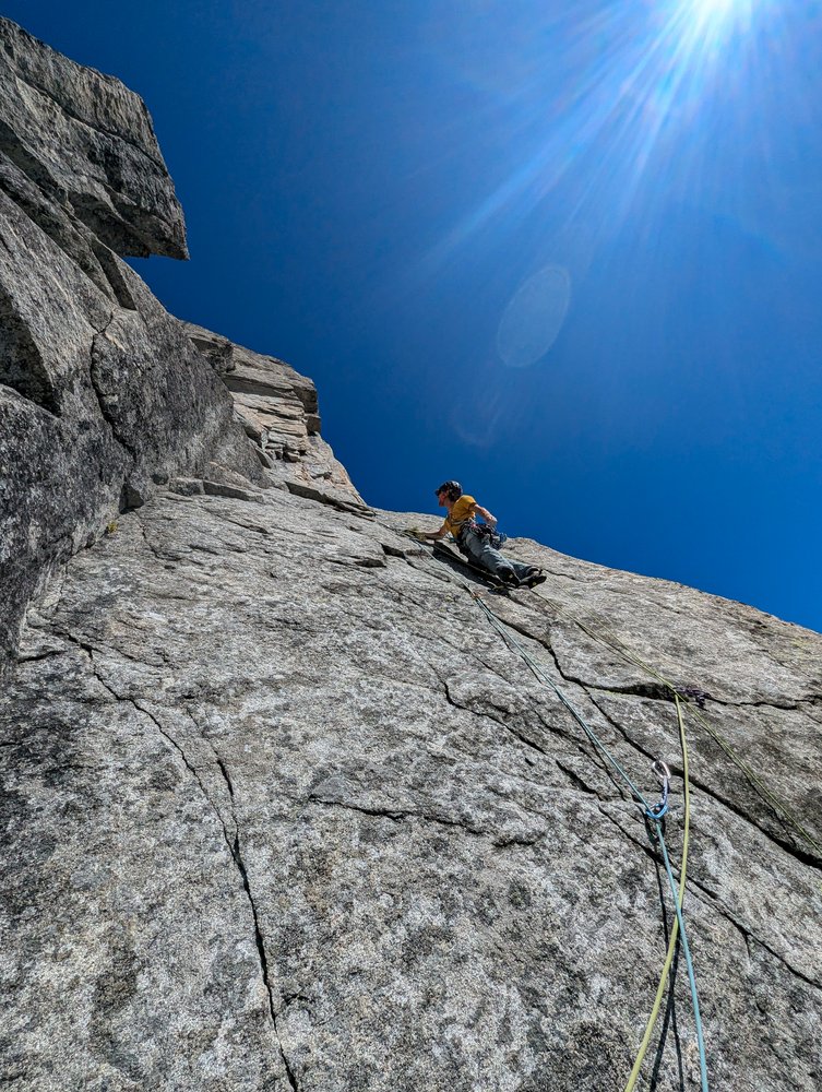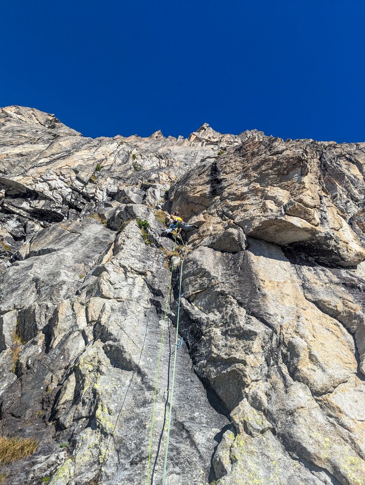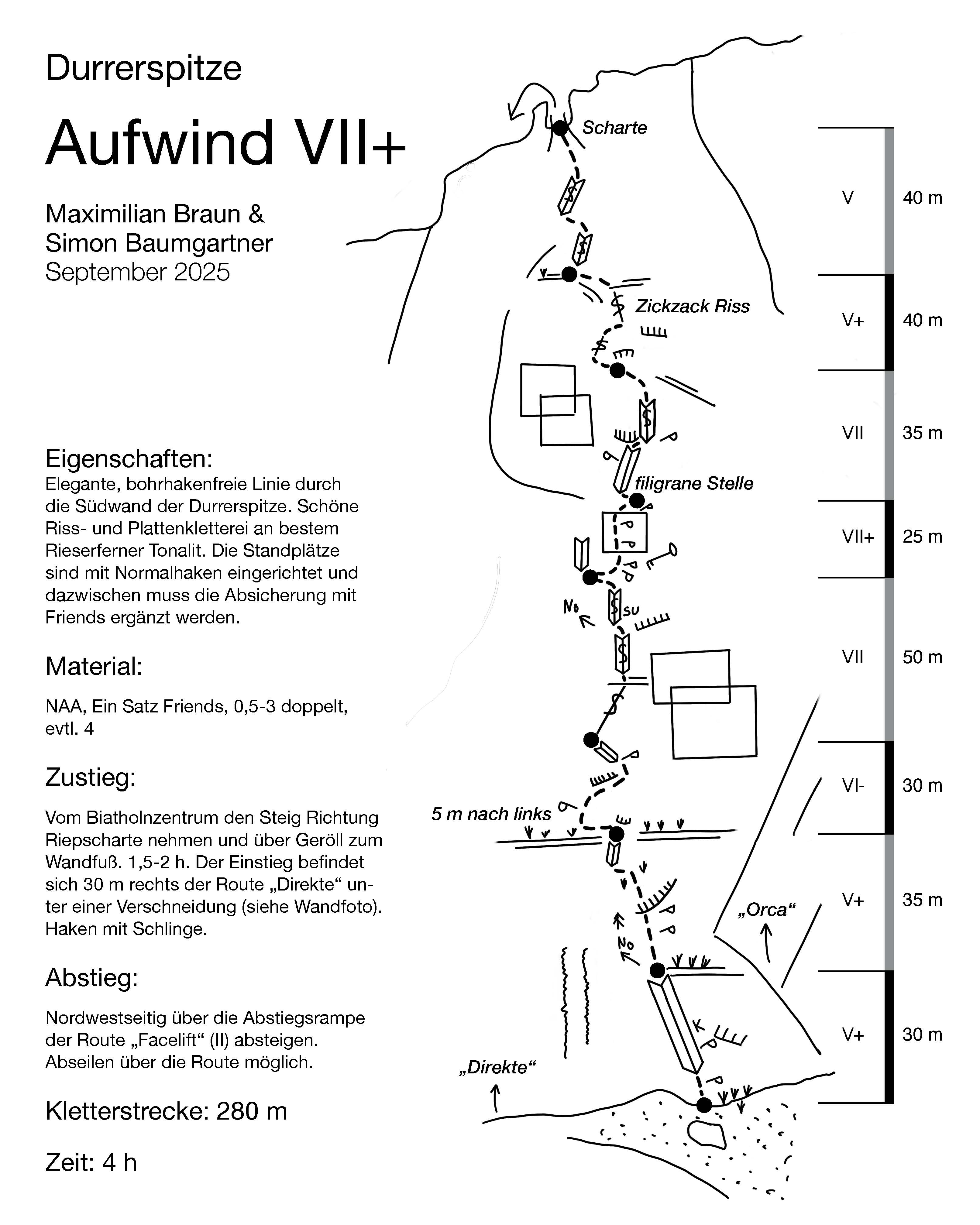 Elegante, bohrhakenfreie Linie durch die Südwand der Durrerspitze. Abwechslungsreiche Riss- und Plattenkletterei an bestem Rieserferner Tonalit. Man klettert entlang einiger toller Felsformationen, darunter ein ästhetisches Dach und ein Zick Zack Riss.