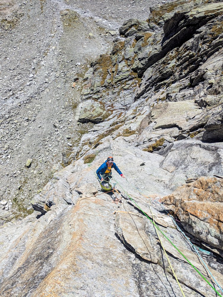 13 Zwischenhaken und einige gefädelte Sanduhren wurden belassen. Zusammen mit genügend Friends lässt sich die Tour super absichern. Die meist angenehmen Standplätze sind mit Normalhaken, viele davon vom AVS-Alpinfonds, eingerichtet.