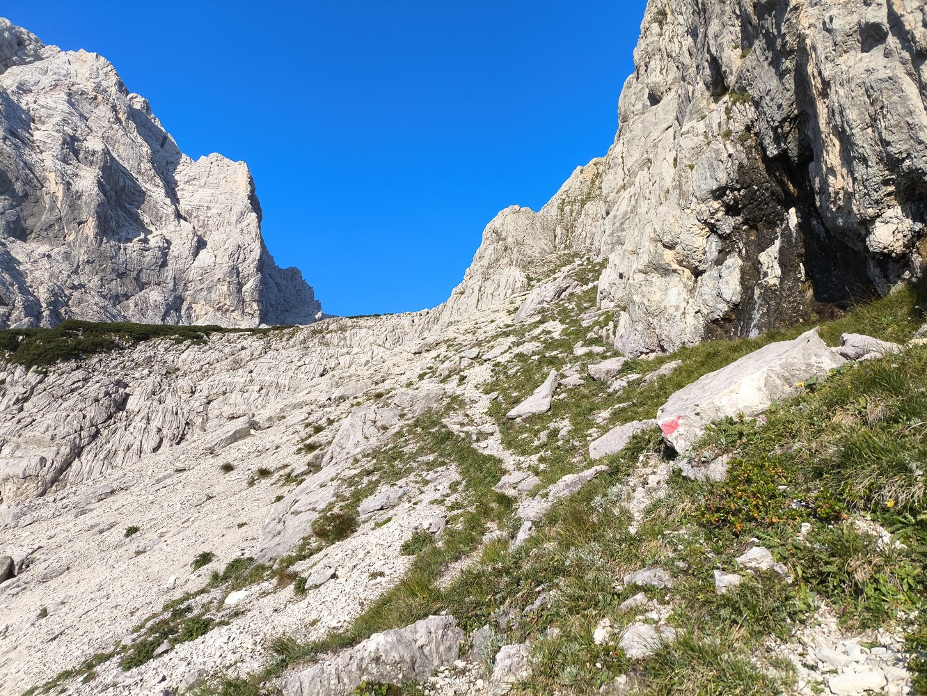 Vom Ende der Kletterei weiter in Richtung Nordgipfel, meistens geht und kraxelt man unterhalb der Gratkante an der Westseite auf Bändern. Vom Nordgipfel hinunter zur Brotfallscharte (Steinmänner/Steigspuren), dort erreicht man den fNormalweg zum Großen Priel. Auf diesem anfangs steil (Stahlseilsicherungen) in das Kühkar absteigen, dann auf dem Wanderweg zurück zum Prielschutzhaus.