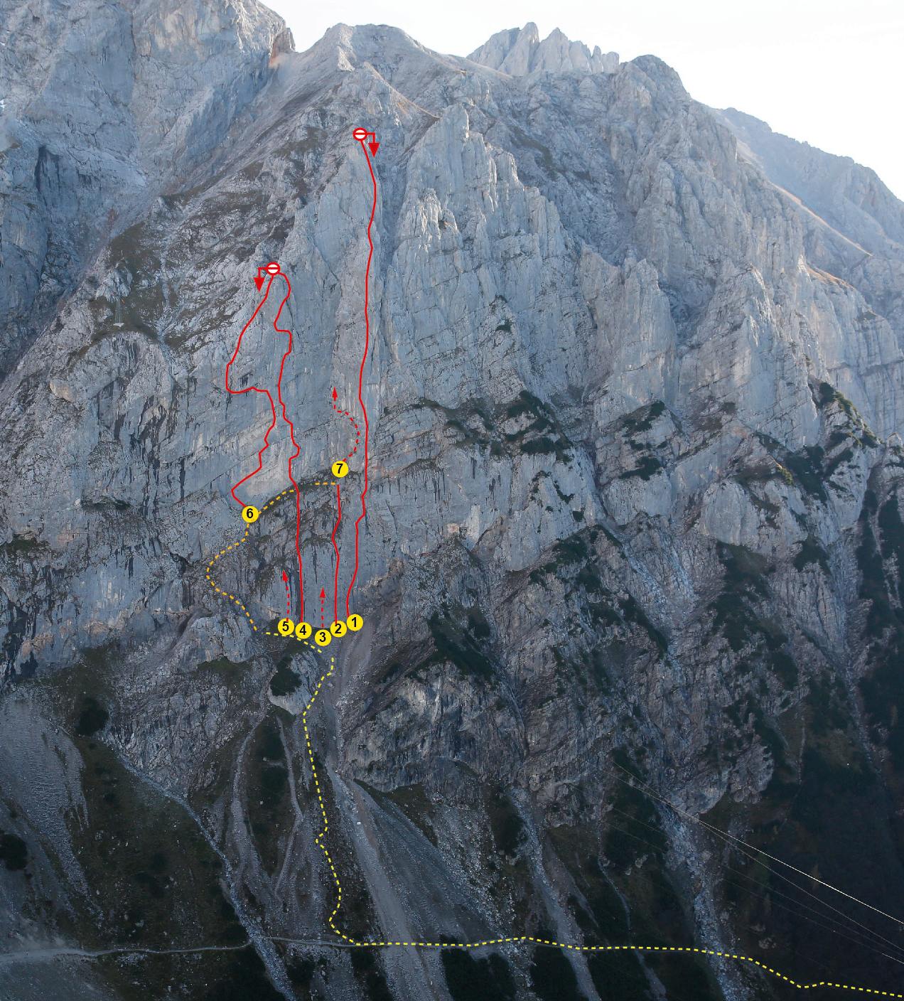 Route ist zwar nicht gefährlich, aber durchaus psychisch anspruchsvoll. Alle Stellen sind zwingend zu kltettern, insbesondere die Crux. In den SL 1, 4, 6 teilweise weite Runouts im oberen 7ten Grad.