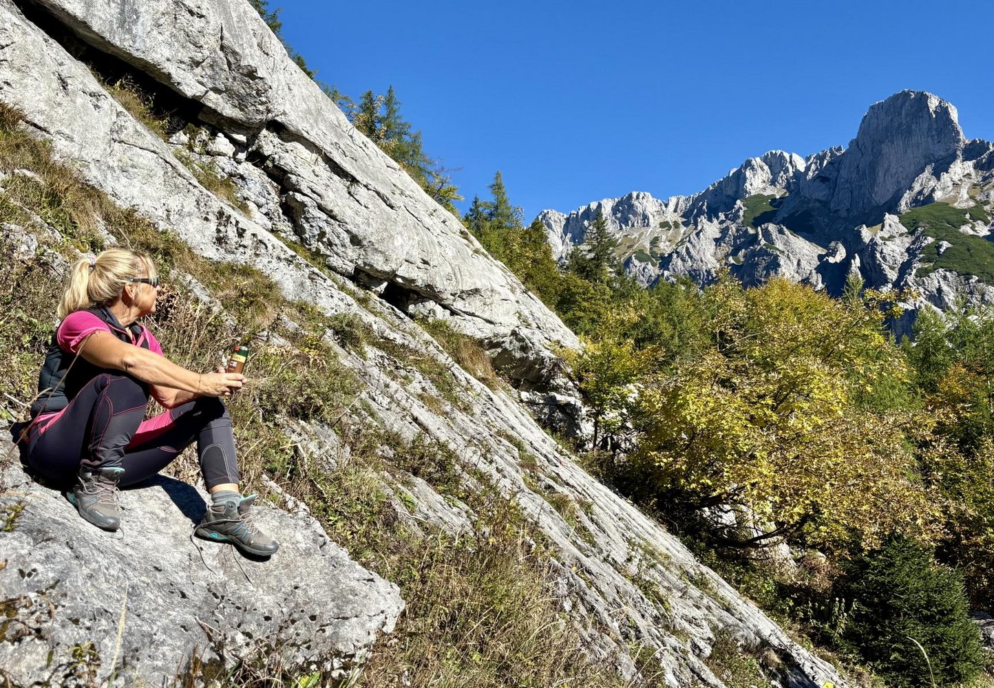 Oder: Vom Ausstieg nahezu waagrecht (Steigspuren und Steinmänner) in 5 min. zum Ausweichkogel.